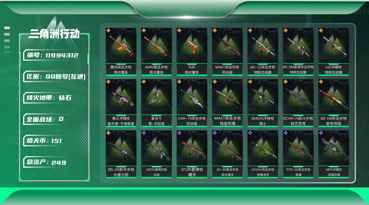 [11994312]总资产:249.4M 2干员外观 15传说枪械 哈夫币:151K 可二次 可修改实名 烽火地带段位:钻石 全面战场段位:上等兵 传说武器皮肤:AS Val突击步枪-蛇年祥瑞,SR-25射手步枪-水墨云图,SCAR-H战斗步枪-铁艺苍穹,AK-12突击步枪-特斯拉线圈,SR-3M紧凑突击步枪-特斯拉线圈,UZI冲锋枪-特斯拉线圈,勇士冲锋枪-能天使-午夜邮差,腾龙突击步枪-捞点薯条,93R-捞点薯条,AWM狙击步枪-捞点薯条,SMG45冲锋枪-骑士,M4A1突击步枪-阿米娅,CAR-15突击步枪-阿米娅,复合弓-黑-天际线,M4A1突击步枪-蚀金玫瑰 史诗武器皮肤:SR-3M紧凑突击步枪-英雄,QBZ95-1突击步枪-ACE,AUG突击步枪-特勤执行,M4A1突击步枪-特勤执行,Vector冲锋枪-红色彗星,PTR-32战斗步枪-ACE,SKS射手步枪-ACE,PKM通用机枪-蝮蛇,M700狙击步枪-蝮蛇,AUG突击步枪-蝮蛇,SR-25射手步枪-战场英杰,G3战斗步枪-战场英杰,M1014霰弹枪-林中猎手,SV-98狙击步枪-林中猎手,PTR-32突击步枪-英雄,M250通用机枪-囚徒,M16A4突击步枪-竞赛选手,ASh-12战斗步枪-刀锋,沙漠之鹰-曙光,S12K霰弹枪-曙光,QBZ95-1突击步枪-曙光,Vector冲锋枪-阿萨拉文明,SVD狙击步枪-阿萨拉工艺,93R-博士,MP5冲锋枪-深海恐惧,勇士冲锋枪-深海恐惧,SG552突击步枪-深海恐惧,AKM突击步枪-林中猎手,M700狙击步枪-竞技风,QSZ92G-风林火山,PKM通用机枪-英雄 干员外观:露娜-黑·天际线,威龙-壮志凌云