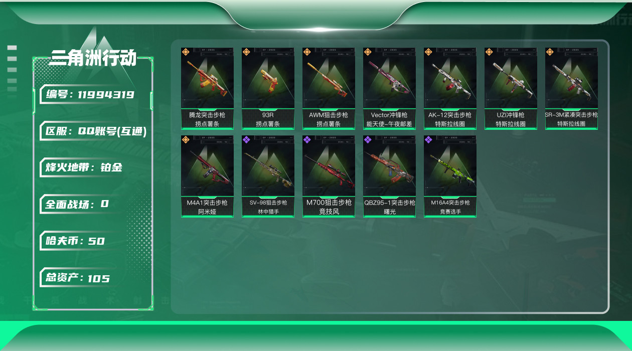 [11994319]总资产:105M 8传说枪械 哈夫币:50.172K 可二次 可修改实名 烽火地带段位:铂金 全面战场段位:无段位 传说武器皮肤:AK-12突击步枪-特斯拉线圈,SR-3M紧凑突击步枪-特斯拉线圈,UZI冲锋枪-特斯拉线圈,Vector冲锋枪-能天使-午夜邮差,腾龙突击步枪-捞点薯条,93R-捞点薯条,AWM狙击步枪-捞点薯条,M4A1突击步枪-阿米娅 史诗武器皮肤:SV-98狙击步枪-林中猎手,M16A4突击步枪-竞赛选手,QBZ95-1突击步枪-曙光,M700狙击步枪-竞技风