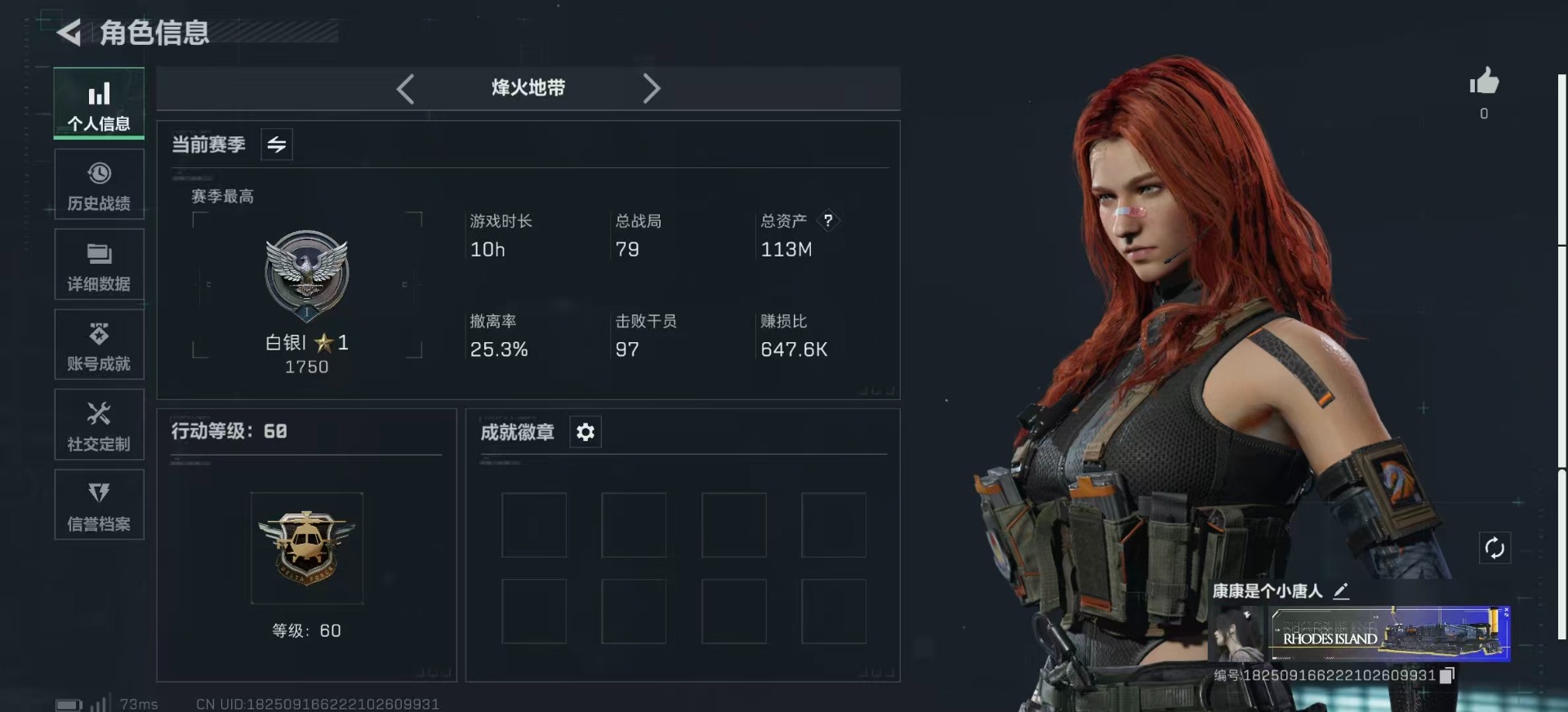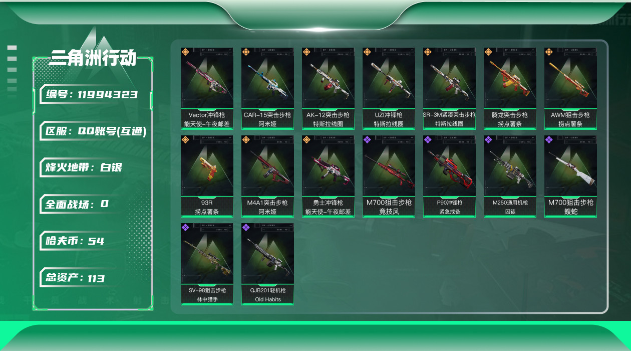 [11994323]总资产:113M 10传说枪械 哈夫币:54.960K 可二次 可修改实名 烽火地带段位:白银 全面战场段位:无段位 传说武器皮肤:AK-12突击步枪-特斯拉线圈,SR-3M紧凑突击步枪-特斯拉线圈,UZI冲锋枪-特斯拉线圈,勇士冲锋枪-能天使-午夜邮差,Vector冲锋枪-能天使-午夜邮差,腾龙突击步枪-捞点薯条,93R-捞点薯条,AWM狙击步枪-捞点薯条,M4A1突击步枪-阿米娅,CAR-15突击步枪-阿米娅 史诗武器皮肤:M700狙击步枪-蝮蛇,SV-98狙击步枪-林中猎手,M250通用机枪-囚徒,P90冲锋枪-紧急戒备,QJB201轻机枪-Old Habits,M700狙击步枪-竞技风