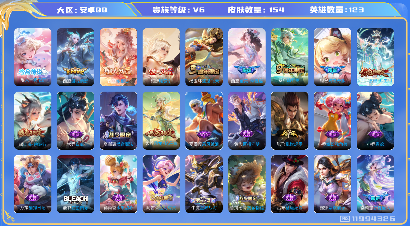 [11994326]V6 1珍品传说 5传说 123英雄 154皮肤 可修改实名 优质装备:大耳狗之梦,游龙清影(小青龙),涂山容容 传说皮:貂蝉曦玄引,续相思 珍宝阁皮:万物之道,女武神 限定皮:愿照·众生和(妲己年限),鸣野蒿,山海·碧波行(瑶年限),至美·乘鲤谣,遇见飞天,时之奇旅-妲己 史诗皮:星界战将,石田雨龙,百相守梦-周瑜,幻珠鲛人,破空之剑,蒙犽顽岩魄,蔬乡物语(鲁班七号),乘龙·忆丹青(大乔年限),百相守梦-黄忠,织梦人,遇见神鹿,紫霞仙子,特工魅影,江河有灵,高渐离燃音魔法,蒙恬荣光圣徽,青蛇,白蛇,猫狗日记-孙策,乱世虎臣,女仆咖啡,摇滚巨星,水果甜心,绅士熊喵,心灵骇客,鬼剑武藏,舞动绿茵,诗语江南,拒霜思,缤纷独角兽,乘风破浪,逐浪之夏,圣诞狂欢,圣诞恋歌,鹰眼统帅,魅力维加斯