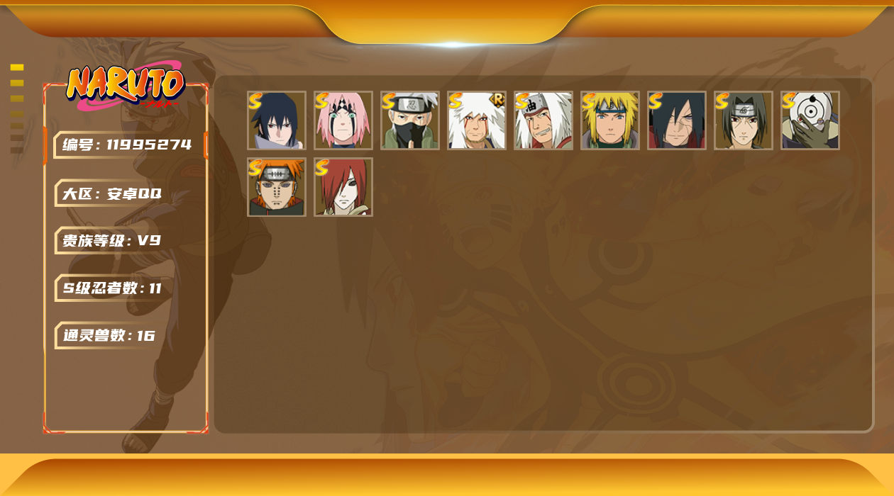 [11995274]V9 11S忍 24A忍 16通灵 624.4W战力 可二次 可修改实名 优质装备:熊猫,长门「秽土转生」,“宇智波斑” 「白面具」,春野樱 「忍界大战」,宇智波佐助「永恒万花筒」,宇智波斑「秽土转生·解」,旗木卡卡西「须佐能乎」,自来也 「传说中的三忍」 S级忍者:自来也 「舞之豪杰」,宇智波鼬 「须佐能乎」,佩恩「天道」,波风水门