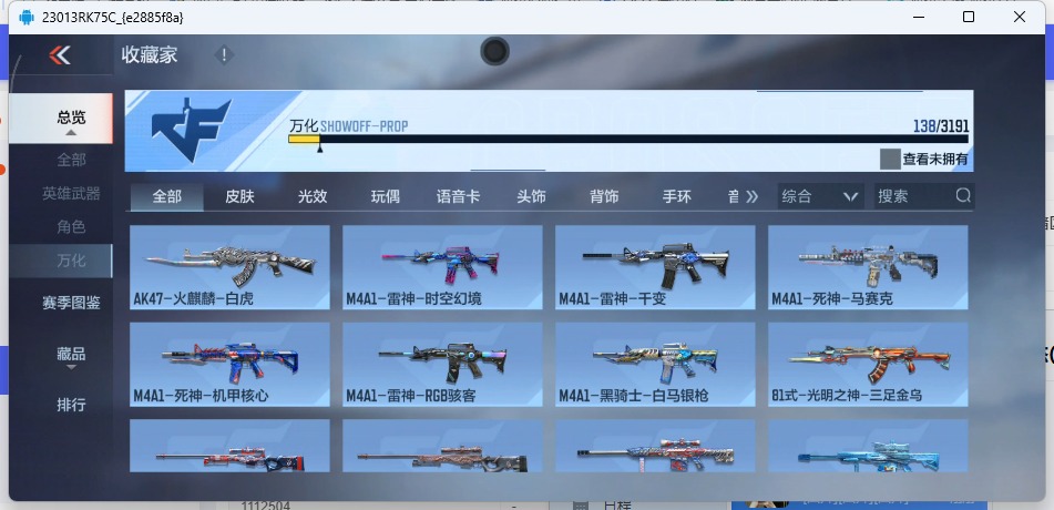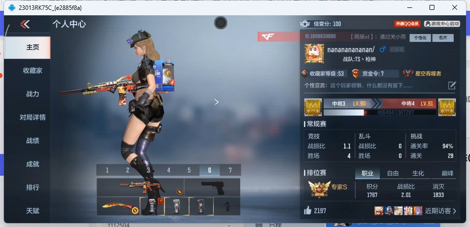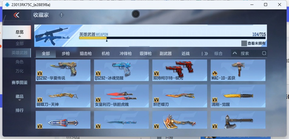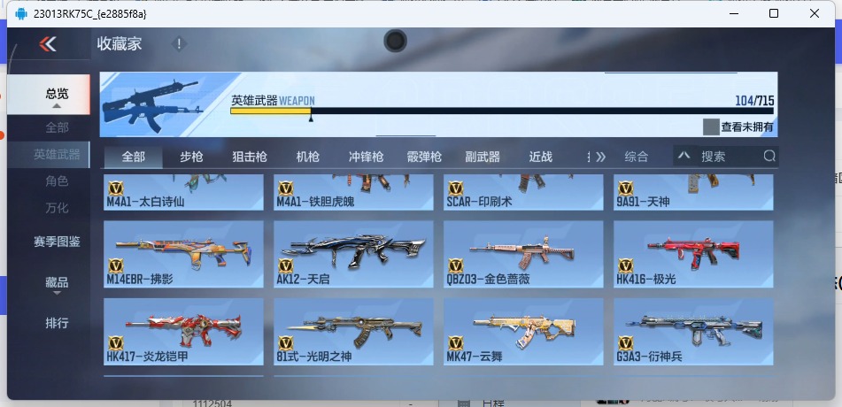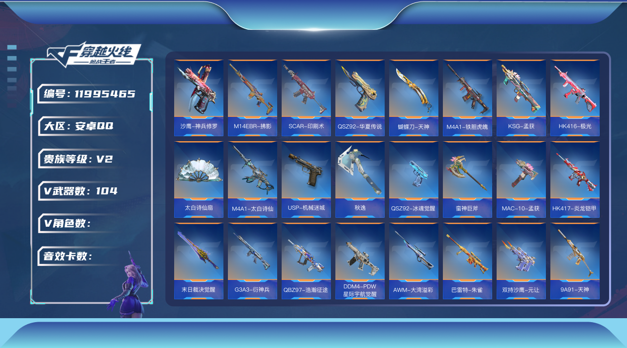 [11995465]可二次 可修改实名 V2 104英雄武器 138万化 专家S 武器:M200-幻神,MK47-云舞,81式-光明之神,KSG-孟获,AK47-死神,M4A1-死神,M4A1-雷神,M4A1-黑骑士,AK47-火麒麟,AK47-木兰,巴雷特-极光,巴雷特-毁灭,QBZ03-金色蔷薇,AK47-血武士,AK12-天启,9A91-天神,AWM-天龙,SCAR-印刷术,M14EBR-拂影,AK47-破空冰刃,AA12-火药,寒霜烈龙,M4A1-太白诗仙,HK416-极光,QSZ92-华夏传说,沙鹰-神兵修罗,沙鹰-修罗,USP-机械迷城,M4A1-铁胆虎魄,马来剑-毁灭,尼泊尔-冰锋觉醒,唐刀-华夏传说,麒麟刺,血月,屠龙,秋逸,太白诗仙扇,蝴蝶刀-天神,女皇利刃-铁胆虎魄,炽芒蝶刀,清刚-觉醒,巴雷特-朱雀,QBZ97-浩瀚征途,马来剑-耀金伯爵,双持沙鹰-元让,DDM4-PDW-星际宇航觉醒,G3A3-衍神兵,末日裁决觉醒,HK417-炎龙铠甲,MAC-10-孟获,QSZ92-冰魂觉醒,蛮神巨斧,AWM-大湾溢彩