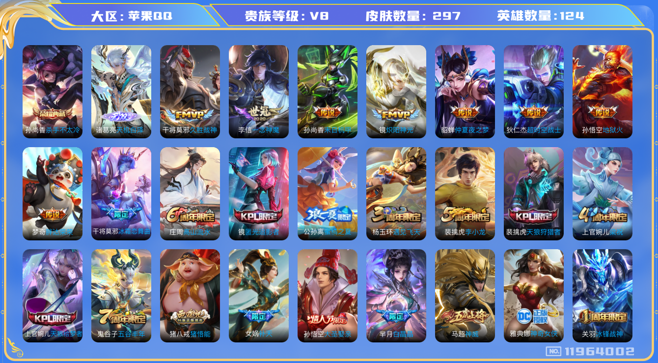 [11964002]V8 1典藏 1无双 10传说 124英雄 297皮肤 可修改实名 优质装备:杀手不太冷,天机白泽,久胜战神,炽阳神光,一念神魔,末日机甲-孙尚香(绿蚂蚱),地狱火,仲夏夜之梦(大飞蛾),胖达荣荣,超时空战士-狄仁杰,涂山容容 珍宝阁皮:妄想食味,女武神 限定皮:补天,白晶晶,神威(电光马子),遇见飞天,高山流水,五谷丰年,冰锋战神,梁祝,天狼狩猎者,天狼绘梦者,李小龙,猪悟能,大圣娶亲,冰霜恋舞曲,蜜橘之夏,神奇女侠,匿光追影者 史诗皮:石田雨龙,百相守梦-周瑜,百相守梦-黄忠,紫霞仙子,电玩小子(小书包),白龙吟,黄金分割率,特工魅影,千年之狐,魅语,高渐离燃音魔法,无限星赏官,冰冠公主,晚萤,暗夜猫娘,末日机甲-吕布,猫狗日记-孙策,乱世虎臣,节奏热浪,修罗,摇滚巨星,水果甜心,绅士熊喵,星夜王子,心灵骇客,功夫厨神,暗隐猎兽者,幽灵船长,鬼剑武藏,暗渊魔法,心灵战警,舞动绿茵,地狱岩魂,纤云弄巧,繁星吟游(呼啦呼啦),拒霜思,缤纷独角兽,乘风破浪,逐浪之夏,水晶猎龙者,箭羽风息,金属风暴,原初追逐者,圣诞狂欢,圣诞恋歌,鹰眼统帅,王者之锤,暗夜贵公子,魅力维加斯,黎明之约,赏金猎手,无心,未来纪元-赵云