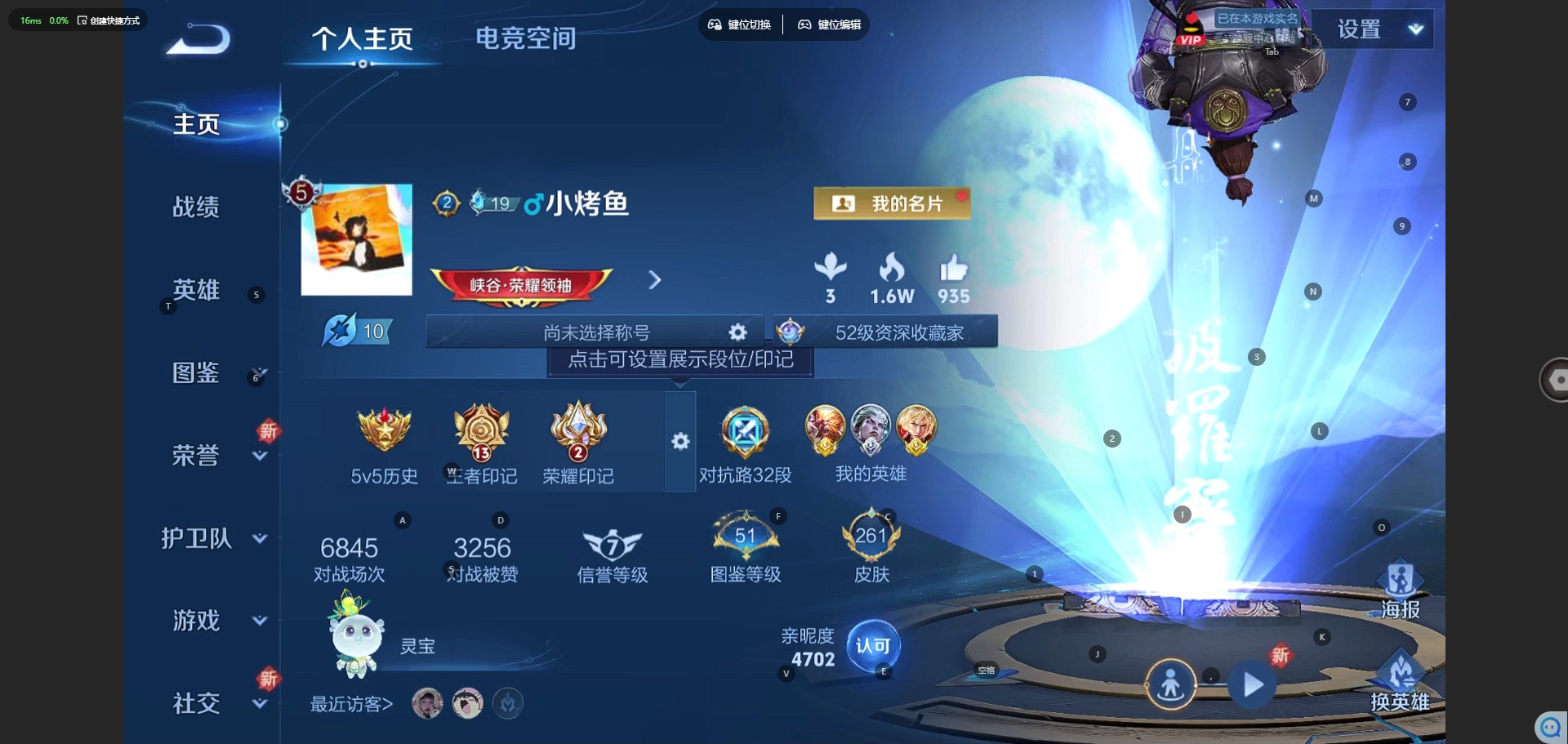 - PX_2102186-实名: 可修改 性别: 男号 贵族等级: V5 英雄数: 61 皮肤数: 68 荣耀水晶: 九霄神辉 传说皮: 久胜战神 限定皮: 鸣野蒿,愿照·九州拓 亮点: 【店长推荐精品号】性价比练手小号,4王者印记,9156战力银标杨戬,花木兰荣耀典藏九霄神辉,3传说,澜蛇年限定,干将久胜战神,2529星币。