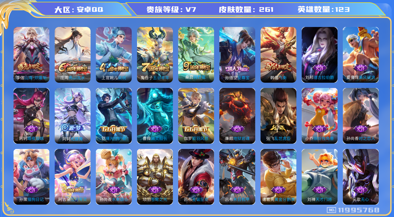 [11995768]V7 2传说 123英雄 261皮肤 可修改实名 优质装备:山海·炽霜斩(李信年限) 珍宝阁皮:优雅恋人,玩趣恶龙 限定皮:鸣野蒿,至尊宝,飞衡(韩信年限),高山流水,五谷丰年,梁祝 史诗皮:化蝶舞,破空之剑,苍穹之光,白龙吟,黄金分割率,特工魅影,千年之狐,江河有灵,百解令(蒙犽),蒙恬荣光圣徽,冰冠公主,偶像歌手,暗夜猫娘,末日机甲-吕布,猫狗日记-孙策,时之恋人-孙尚香,乱世虎臣,修罗,女仆咖啡,摇滚巨星,水果甜心,天才门将,星夜王子,心灵骇客,功夫厨神,德古拉伯爵,暗隐猎兽者,幽灵船长,鬼剑武藏,心灵战警,地狱岩魂,纤云弄巧,拒霜思,缤纷独角兽,乘风破浪,逐浪之夏,水晶猎龙者,曙光守护者,箭羽风息,金属风暴,原初追逐者,圣诞狂欢,圣诞恋歌,鹰眼统帅,魅力维加斯,黎明之约,无心,未来纪元-赵云