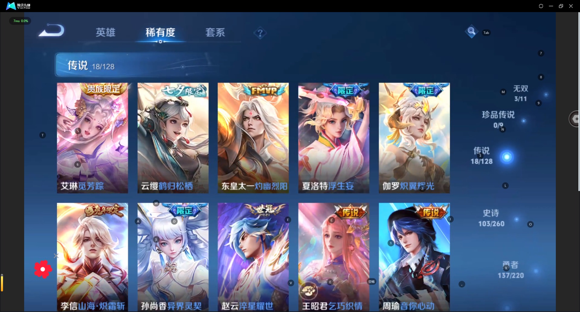 - [11432607]V7 2典藏 8传说 125英雄 269皮肤 可修改实名 优质装备:全息碎影(猴子典藏),弑枪猎影(韩信典藏),冠军飞将,仲夏夜之梦(大飞蛾),超时空战士-狄仁杰,末日机甲-孙策,山海·炽霜斩(李信年限) 珍宝阁皮:蔷薇恋人,玩趣恶龙 限定皮:愿照·九州拓(澜年限),鸣野蒿,高山流水,齐天大圣,游园惊梦,梁祝,李小龙,孙行者,大圣娶亲,山海·玄木吟(马可年限) 史诗皮:芈月浮光幕影,怒海争锋,蔬乡物语(鲁班七号),化蝶舞,破空之剑,紫霞仙子,苍穹之光,电玩小子(小书包),白龙吟,黄金分割率,特工魅影,千年之狐,冰冠公主,偶像歌手,无限星赏官,魅语,暗夜猫娘,龙骑士(小龙虾),末日机甲-吕布,猫狗日记-孙策,猫狗日记-大乔,乱世虎臣,节奏热浪,修罗,女仆咖啡,摇滚巨星,水果甜心,绅士熊喵,天才门将,星夜王子,心灵骇客,功夫厨神,德古拉伯爵,暗隐猎兽者,幽灵船长,鬼剑武藏,心灵战警,天秀·启明,舞动绿茵,地狱岩魂,纤云弄巧,缤纷独角兽,乘风破浪,逐浪之夏,月团寄思,水晶猎龙者,曙光守护者,箭羽风息,金属风暴,圣诞狂欢,圣诞恋歌,鹰眼统帅,暗夜贵公子,魅力维加斯,无心,未来纪元-赵云