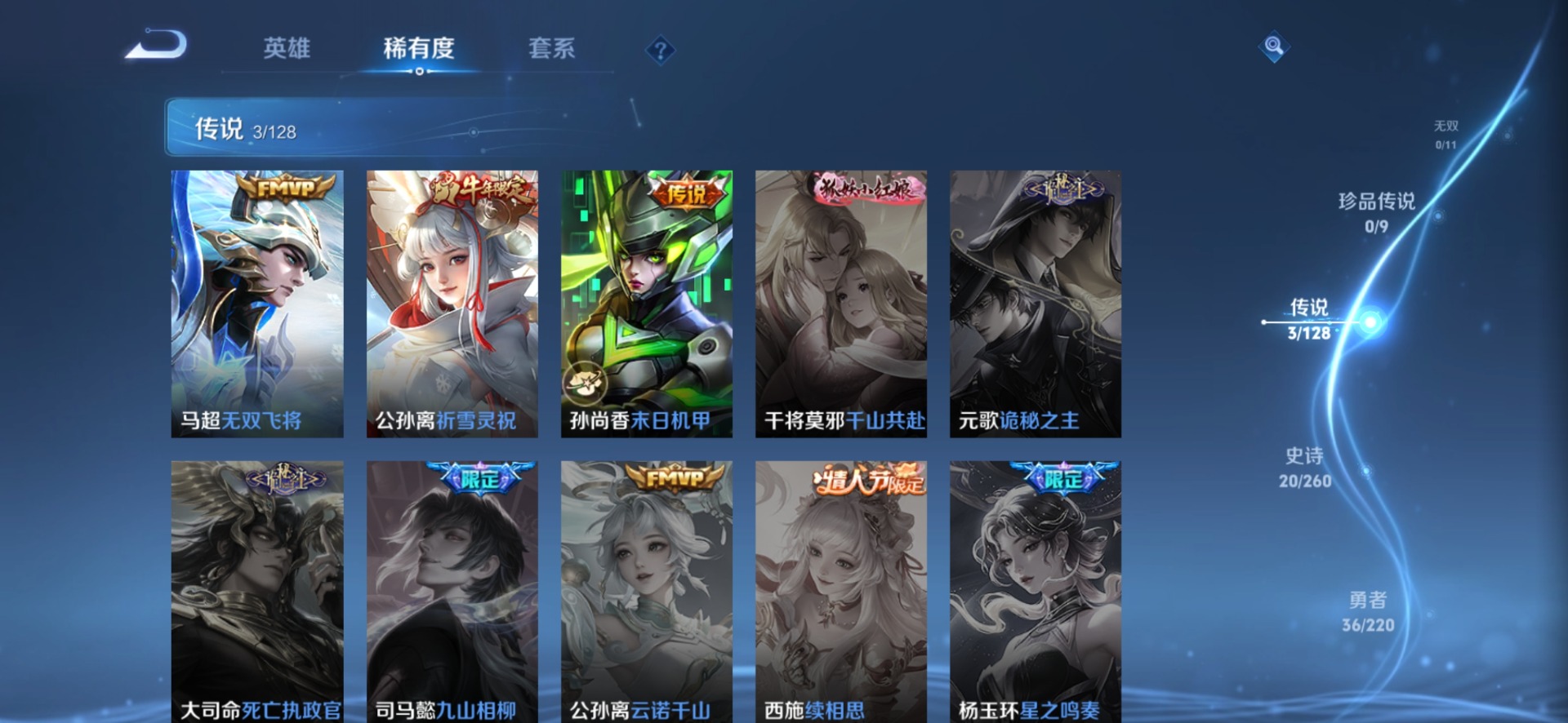 - PX_2096078- 可二次 V9 贵族积分 安卓QQ/353皮肤/125英雄/3典藏/0珍品无双/0无双/4珍品传说/37传说/103史诗/9稀有英雄 【2 星传说皮肤】,未来机甲 孙尚香,幽冥之眼 宫本武藏, 【4 珍品传说】,大耳狗之梦 瑶,怪盗基德 马可波罗,时之奇旅 孙策,兔狲·蓬尾 张飞, 【3 典藏皮肤】,鸣剑·曳影 李白,弑枪猎影 韩信,星域神启 诸葛亮, 【37 传说皮肤】,胖