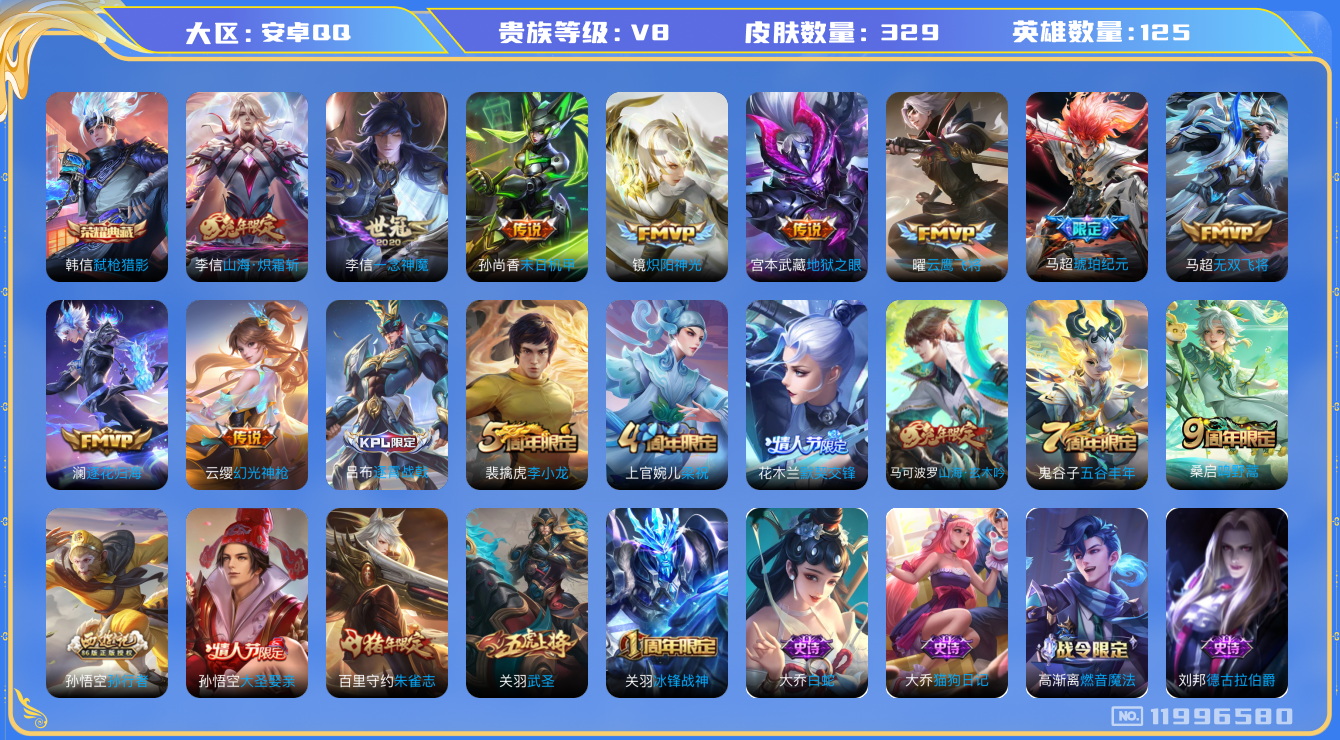 [11996580]V8 1典藏 13传说 125英雄 329皮肤 可修改实名 优质装备:弑枪猎影(韩信典藏),云鹰飞将(小将军),炽阳神光,一念神魔,末日机甲-孙尚香(绿蚂蚱),地狱之眼,无双飞将,山海·炽霜斩(李信年限),澜逐花归海,琥珀纪元马超,涂山容容 传说皮:幻光神枪 珍宝阁皮:胡桃夹子,优雅恋人,女武神 限定皮:逐霄战戟,鸣野蒿,五谷丰年,冰锋战神,武圣,梁祝,李小龙,朱雀志(守约年限),默契交锋-花木兰,孙行者,大圣娶亲,山海·玄木吟(马可年限) 史诗皮:星界战将,谪仙醉月,龙之律动,破空之剑,战舞者,琥珀纪元伽罗,蔬乡物语(鲁班七号),百相守梦-百里守约,百相守梦-黄忠,遇见神鹿,紫霞仙子,苍穹之光,电玩小子(小书包),黄金分割率,特工魅影,千年之狐,江河有灵,魅语,百解令(蒙犽),高渐离燃音魔法,蒙恬荣光圣徽,无限星赏官,冰冠公主,偶像歌手,白蛇,电玩·爆裂旋风,龙骑士(小龙虾),末日机甲-吕布,猫狗日记-孙策,猫狗日记-大乔,时之恋人-孙尚香,乱世虎臣,节奏热浪,修罗,女仆咖啡,摇滚巨星,水果甜心,绅士熊喵,天才门将,星夜王子,心灵骇客,功夫厨神,德古拉伯爵,暗隐猎兽者,幽灵船长,鬼剑武藏,心灵战警,天秀·启明,舞动绿茵,地狱岩魂,诗语江南,纤云弄巧,繁星吟游(呼啦呼啦),缤纷独角兽,乘风破浪,逐浪之夏,水晶猎龙者,曙光守护者,箭羽风息,金属风暴,原初追逐者,圣诞狂欢,圣诞恋歌,鹰眼统帅,暗夜贵公子,魅力维加斯,黎明之约,赏金猎手,无心,未来纪元-赵云
