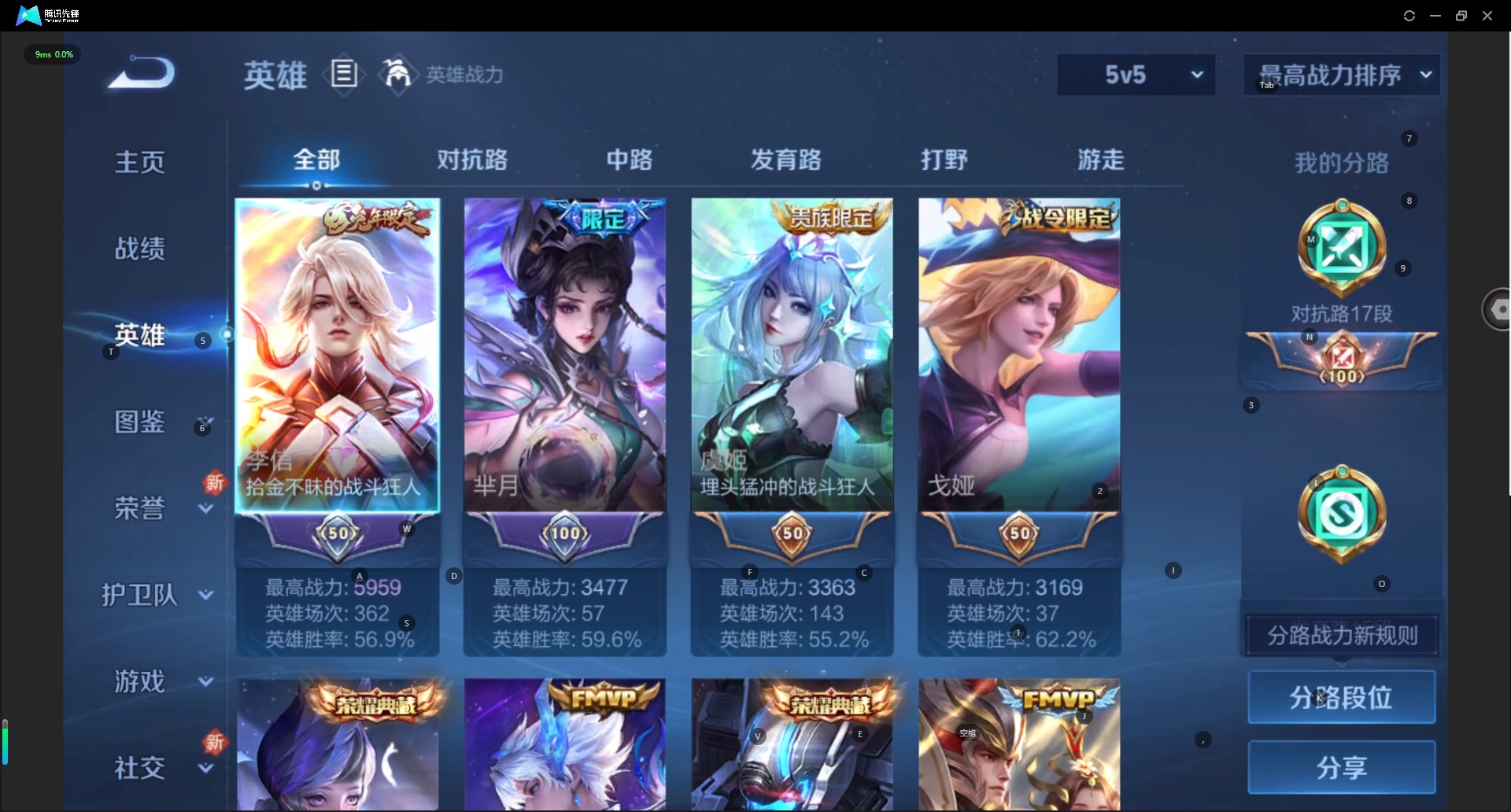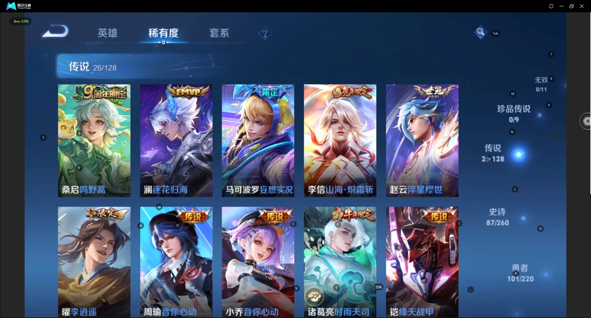 - [12164599]V8 15传说 124英雄 272皮肤 可修改实名 优质装备:冠军飞将,云鹰飞将(小将军),猫影幻舞,久胜战神,炽阳神光,一念神魔,末日机甲-孙尚香(绿蚂蚱),游龙清影(小青龙),超时空战士-狄仁杰 珍宝阁皮:优雅恋人,蔷薇恋人 限定皮:至尊宝,白虎志(电光耗子),傲雪梅枪,寅虎·展翼(孙膑年限),白鹤梁神女,时雨天司(水龙头),神威(电光马子),飞衡(韩信年限),高山流水,五谷丰年,幽恒(沐浴露),武圣,梁祝,御风骁将(吕布年限),奔雷神使(牛魔年限),祈雪灵祝(雪兔子),天狼绘梦者,李小龙,朱雀志(守约年限),如梦令-嫦娥,如梦令-后羿,霸王别姬-项羽,霸王别姬-虞姬,默契交锋-兰陵王,默契交锋-花木兰,猪悟能,冰霜恋舞曲,匿光追影者,寅虎·心曲(虎婆) 史诗皮:百相守梦-黄忠,紫霞仙子,黄金分割率,千年之狐,冰冠公主,魅语,电玩·爆裂旋风,晚萤,偶像歌手,猫狗日记-孙策,时之恋人-孙尚香,乱世虎臣,修罗,摇滚巨星,水果甜心,绅士熊喵,天才门将,功夫厨神,德古拉伯爵,暗隐猎兽者,鬼剑武藏,地狱岩魂,诗语江南,纤云弄巧,繁星吟游(呼啦呼啦),拒霜思,逐浪之夏,龙鼓争鸣,曙光守护者,金属风暴,原初追逐者,圣诞恋歌,鹰眼统帅,魅力维加斯,黎明之约