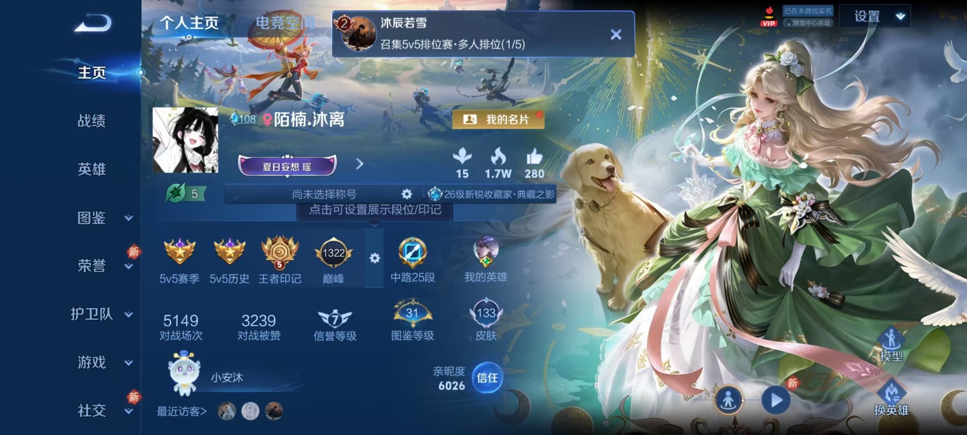 [11997240]V5 1典藏 4传说 115英雄 133皮肤 可修改实名 女号 优质装备:拾光映像(瑶典藏),游龙清影(小青龙) 传说皮:云诺千山 珍宝阁皮:妄想食味 限定皮:愿照·众生和(妲己年限),鸣野蒿,至美·乘鲤谣,山海·玄木吟(马可年限) 史诗皮:器灵·浮梦炉,化蝶舞,龙之律动,破空之剑,蒙犽顽岩魄,乘龙·聚宝船(安琪拉年限),百相守梦-黄忠,织梦人,遇见神鹿,黄金分割率,高渐离燃音魔法,无限星赏官,青蛇,偶像歌手,节奏热浪,女仆咖啡,水果甜心,星夜王子,心灵骇客,德古拉伯爵,鬼剑武藏,舞动绿茵,诗语江南,缤纷独角兽,乘风破浪,曙光守护者,原初追逐者,鹰眼统帅,魅力维加斯