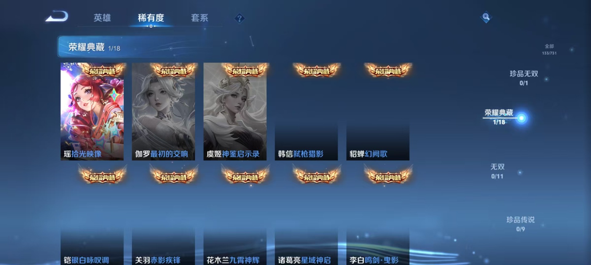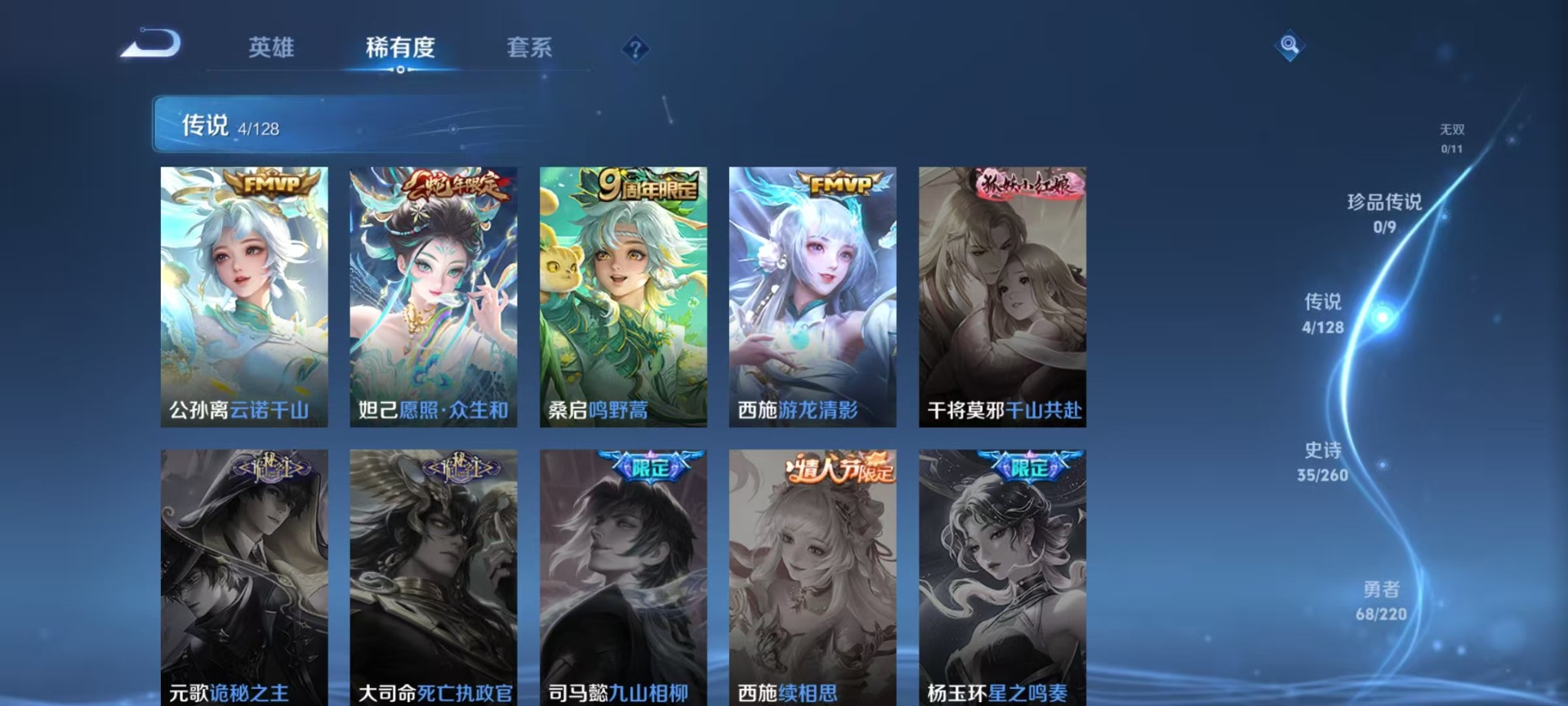 - PX_2079515-24 苹果QQ/至尊星耀/355皮肤/124英雄/2典藏/0珍品无双/0无双/2珍品传说/31传说/114史诗/8稀有英雄 【2 珍品传说】大耳狗之梦 瑶,怪盗基德 马可波罗, 【2 典藏皮肤】银白咏叹调 铠,弑枪猎影 韩信, 【31 传说皮肤】鹤归松栖 云缨,启明星使 虞姬,齐天大圣 孙悟空,神器·狴犴令 狄仁杰,深海之息 马可波罗,凤求凰 李白,仲夏夜之梦 貂蝉,惊梅引