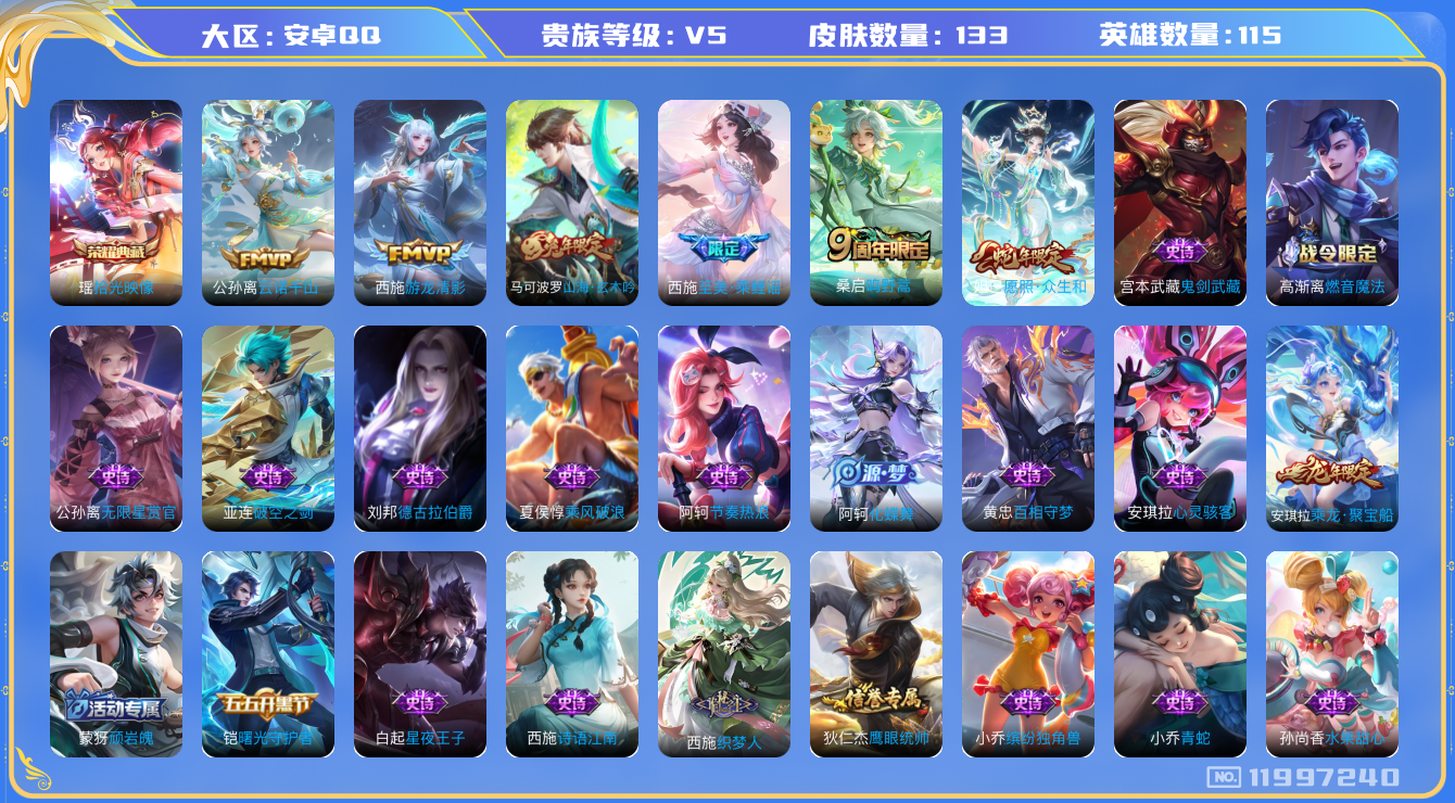 - [11528568]V7 1珍品传说 8传说 114英雄 94皮肤 可修改实名 优质装备:器灵·落星盏,云鹰飞将(小将军),炽阳神光,一念神魔,澜逐花归海 限定皮:愿照·岁时盈(虞姬年限),愿照·山河定(司空震年限),愿照·千秋盛(女娲年限),鸣野蒿 史诗皮:化蝶舞,茶境仙,紫霞仙子,魅语,无限星赏官,电玩·爆裂旋风,节奏热浪,女仆咖啡,水果甜心,心灵骇客,德古拉伯爵,暗隐猎兽者,鬼剑武藏,舞动绿茵,水晶猎龙者,曙光守护者,箭羽风息,圣诞狂欢,圣诞恋歌,鹰眼统帅,魅力维加斯,未来纪元-赵云