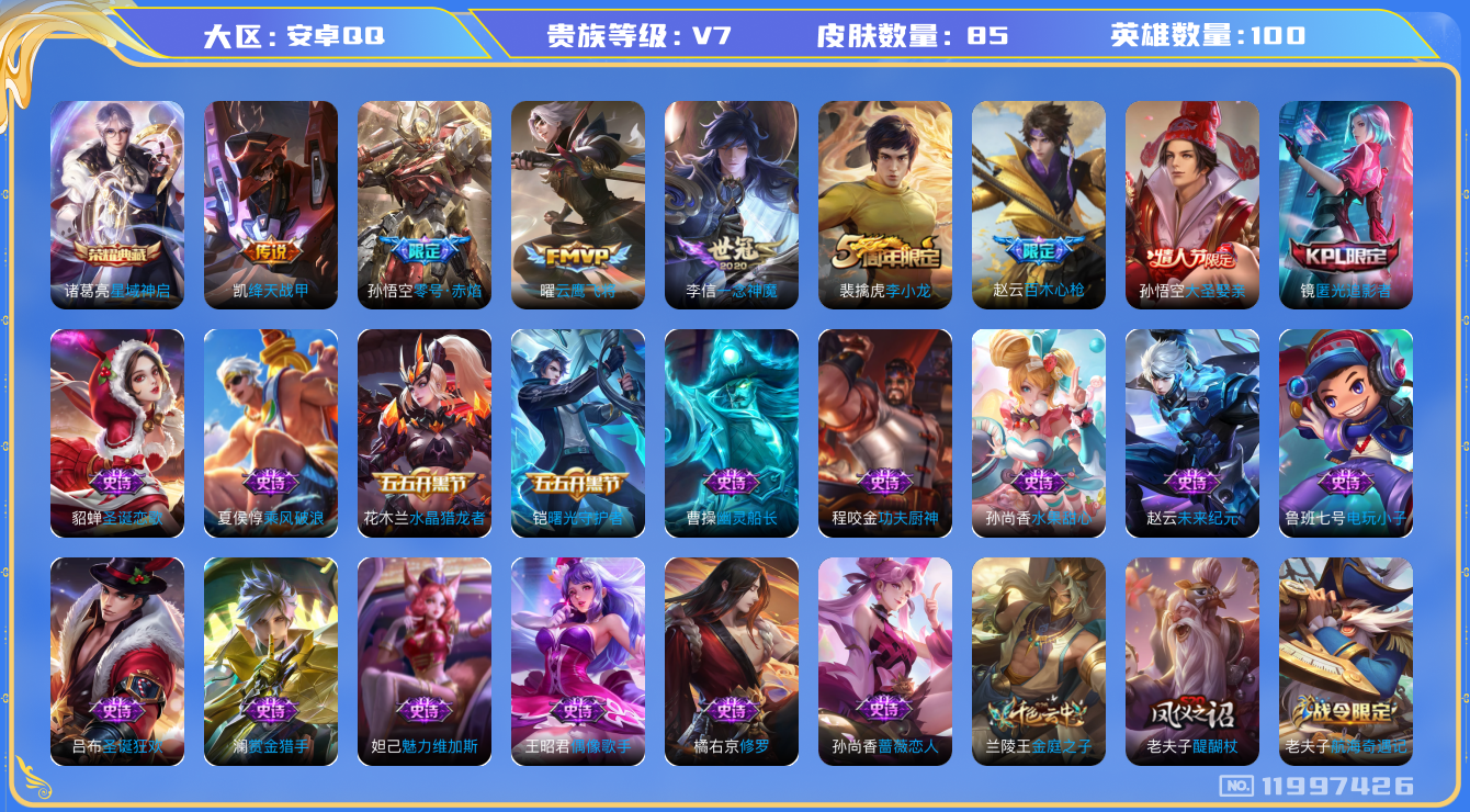 - [11685111]V9 2典藏 27传说 125英雄 363皮肤 典藏英雄武则天 可修改实名 优质装备:天鹅之梦(小乔典藏),大秦宣太后,绛天战甲(鸡嘴战神),黄金白羊座,猫影幻舞,久胜战神,云霓雀翎,地狱火,仲夏夜之梦(大飞蛾),零号·赤焰,海洋之心,飞鸢探春,乞巧织情,游龙清影(小青龙),遇见胡旋,挚爱之约 珍宝阁皮:蔷薇恋人,女武神 限定皮:凤凰于飞,太华(伽罗年限),武陵仙君(小桃花),傲雪梅枪,补天,寅虎·展翼(孙膑年限),时之彼端,白鹤梁神女,魔法小厨娘,白晶晶,时雨天司(水龙头),玄嵩(庄周年限),至美·乘鲤谣,至美·化雀舞,遇见飞天,高山流水,匿光决锋者,五谷丰年,幽恒(沐浴露),天狼运算者,游园惊梦,梁祝,御风骁将(吕布年限),天狼溯光者,逐梦之音,奔雷神使(牛魔年限),祈雪灵祝(雪兔子),天狼绘梦者,李小龙,逐梦之光,如梦令-后羿,霸王别姬-项羽,霸王别姬-虞姬,奇迹圣诞,默契交锋-兰陵王,默契交锋-花木兰,孙行者,猪悟能,天魔缭乱,冰霜恋舞曲,乒乒小将,热情桑巴,女儿国国王,寅虎·御盾(廉颇年限),寅虎·瑞焰(虎皮蛋子),寅虎·心曲(虎婆),寅虎·赤拳(老虎年限),时之祈愿-瑶(瑶传限),无尽星芒 史诗皮:化蝶舞,龙之律动,百相守梦-周瑜,守夜人,紫霞仙子,苍穹之光,电玩小子(小书包),特工魅影,江河有灵,百解令(蒙犽),蒙恬荣光圣徽,偶像歌手,龙骑士(小龙虾),暗夜猫娘,魅语,冰冠公主,青蛇,时之恋人-孙尚香,乱世虎臣,节奏热浪,女仆咖啡,摇滚巨星,水果甜心,绅士熊喵,天才门将,星夜王子,心灵骇客,时之奇旅-安琪拉,功夫厨神,德古拉伯爵,暗隐猎兽者,幽灵船长,鬼剑武藏,心灵战警,舞动绿茵,地狱岩魂,诗语江南,纤云弄巧,繁星吟游(呼啦呼啦),拒霜思,缤纷独角兽,乘风破浪,逐浪之夏,水晶猎龙者,曙光守护者,箭羽风息,唤灵魅影,金属风暴,原初追逐者,圣诞狂欢,圣诞恋歌,鹰眼统帅,魅力维加斯,黎明之约,奇遇舞章,天秀·音浪,寅虎·御盾,千筹问战,无心,未来纪元-赵云