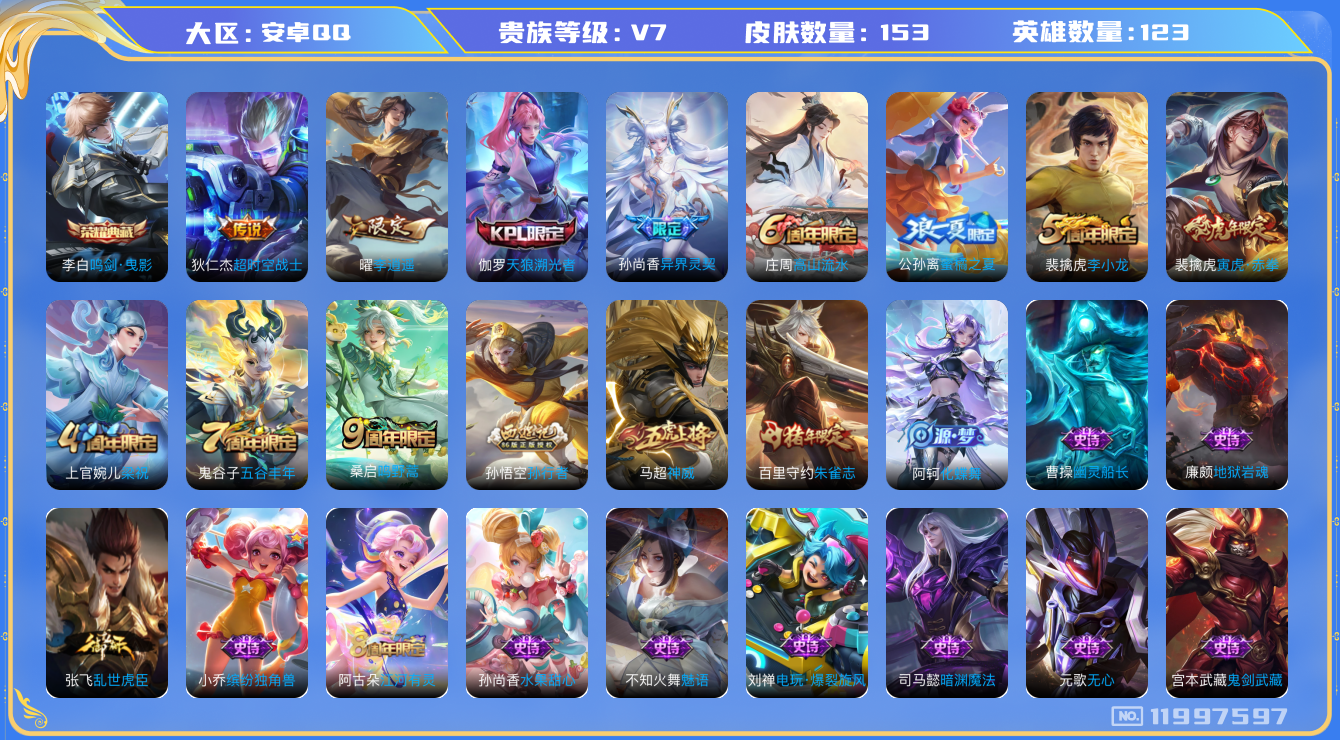 [11997597]V7 1典藏 5传说 123英雄 153皮肤 可修改实名 优质装备:鸣剑·曳影,李逍遥,超时空战士-狄仁杰 珍宝阁皮:女武神,玩趣恶龙 限定皮:鸣野蒿,异界灵契(白毛香),神威(电光马子),高山流水,五谷丰年,梁祝,天狼溯光者,李小龙,朱雀志(守约年限),孙行者,蜜橘之夏,寅虎·赤拳(老虎年限) 史诗皮:化蝶舞,特工魅影,江河有灵,魅语,蒙恬荣光圣徽,冰冠公主,偶像歌手,晚萤,电玩·爆裂旋风,乱世虎臣,修罗,女仆咖啡,摇滚巨星,水果甜心,功夫厨神,暗隐猎兽者,幽灵船长,鬼剑武藏,暗渊魔法,心灵战警,天秀·启明,地狱岩魂,纤云弄巧,拒霜思,缤纷独角兽,水晶猎龙者,金属风暴,原初追逐者,圣诞恋歌,鹰眼统帅,暗夜贵公子,黎明之约,赏金猎手,无心,未来纪元-赵云