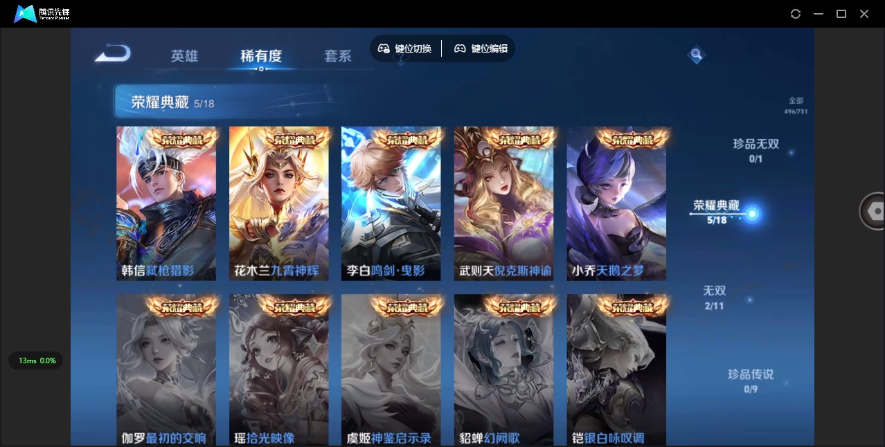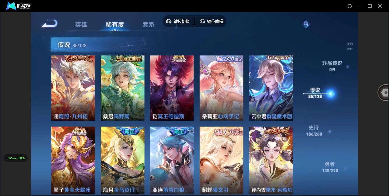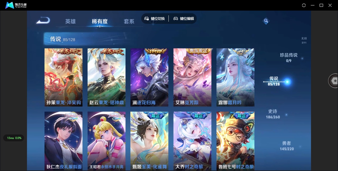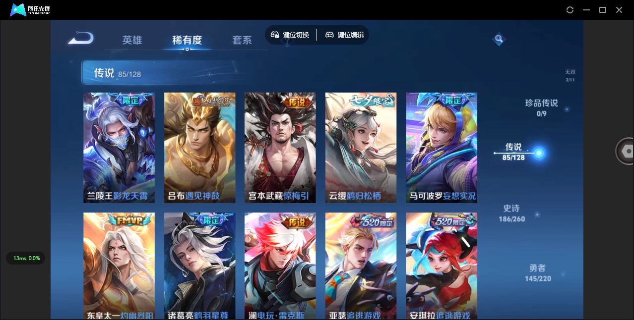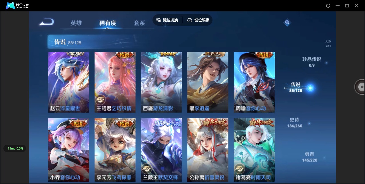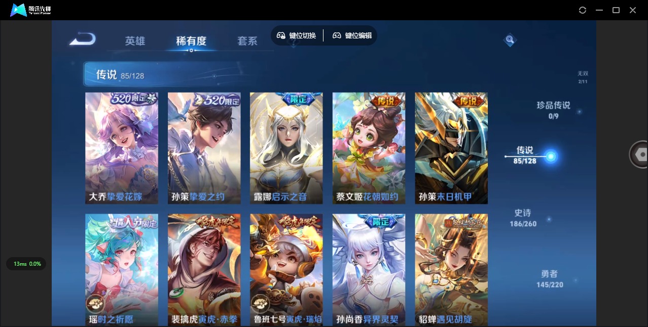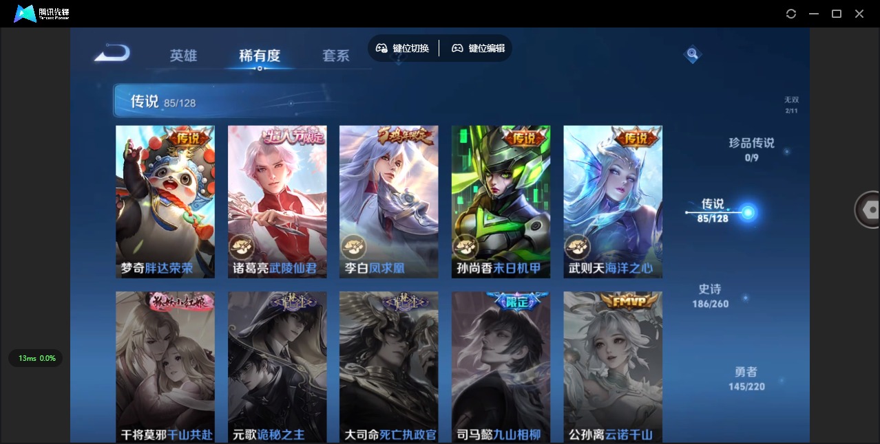 - [11574352]V9 2典藏 1珍品传说 32传说 126英雄 267皮肤 典藏英雄武则天 可修改实名 优质装备:鸣剑·曳影,九霄神辉(木兰典藏),酷洛米之心,黄金射手座,云鹰飞将(小将军),绛天战甲(鸡嘴战神),猫影幻舞,久胜战神,炽阳神光,一念神魔,云霓雀翎,地狱火,海洋之心,地狱之眼,飞鸢探春,胖达荣荣,时之恋人-刘备(电焊工),淬星耀世,遇见胡旋,无双飞将,诡秘之主,涂山容容 传说皮:死亡执政官,九山相柳,云诺千山,星之鸣奏,幻光神枪 珍宝阁皮:玩趣恶龙 限定皮:愿照·九州拓(澜年限),至尊宝,凤凰于飞,太华(伽罗年限),武陵仙君(小桃花),异界灵契(白毛香),傲雪梅枪,时之彼端,神威(电光马子),飞衡(韩信年限),玄嵩(庄周年限),至美·化雀舞,高山流水,诗剑行,怒海麟威,五谷丰年,幽恒(沐浴露),游园惊梦,梁祝,岱宗(典韦年限),虎魄,天狼绘梦者,李小龙,辉光之辰,如梦令-嫦娥,如梦令-后羿,孙行者,引擎之心,天魔缭乱 史诗皮:鸭鸭历险记-刘禅,器灵·浮梦炉,化蝶舞,龙之律动,雪豹·霜爪,石田雨龙,百相守梦-周瑜,蔬乡物语(鲁班七号),百相守梦-黄忠,织梦人,守夜人,遇见神鹿,紫霞仙子,白龙吟,江河有灵,魅语,冰冠公主,偶像歌手,晚萤,龙骑士(小龙虾),猫狗日记-孙策,时之恋人-孙尚香,乱世虎臣,修罗,女仆咖啡,摇滚巨星,水果甜心,星夜王子,心灵骇客,时之奇旅-安琪拉,功夫厨神,德古拉伯爵,幽灵船长,鬼剑武藏,心灵战警,天秀·启明,繁星吟游(呼啦呼啦),缤纷独角兽,乘风破浪,水晶猎龙者,曙光守护者,热力回旋,箭羽风息,金属风暴,圣诞狂欢,鹰眼统帅,奇遇舞章,千筹问战,无心