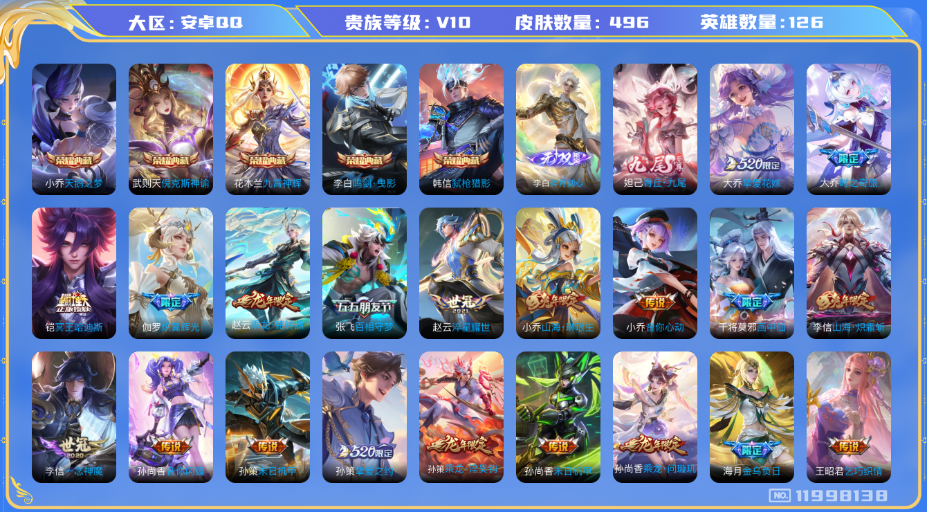[11998138]V10 5典藏 2无双 85传说 126英雄 496皮肤 典藏英雄武则天 女号 可修改实名 优质装备:天鹅之梦(小乔典藏),倪克斯神谕(宇宙婆娘),鸣剑·曳影,九霄神辉(木兰典藏),弑枪猎影(韩信典藏),青丘·九尾(妲己无双),碎月剑心(李白无双),云鹰飞将(小将军),黄金白羊座,猫影幻舞,炽阳神光,一念神魔,云霓雀翎,末日机甲-孙尚香(绿蚂蚱),音你心动-小乔,零号·赤焰,海洋之心,飞鸢探春,音你心动-周瑜,胖达荣荣,李逍遥,乞巧织情,游龙清影(小青龙),淬星耀世,遇见胡旋,末日机甲-孙策,花朝如约(花篮子),挚爱之约,挚爱花嫁,无双飞将,音你闪耀(rap皮),碎云,神器·狴犴令,山海·炽霜斩(李信年限),山海·琳琅生(小乔年限),山海·苍雷引(电光曜子),炽翼辉光(娃娃菜牛角包),燃星之曲,画中仙,浮生妄,记忆之芯(机甲兔),青丘·九尾,百相守梦(张飞),追逃游戏(亚瑟),追逃游戏(安琪拉),电玩·雷克斯,鹤羽星尊,灼幽烈阳,妄想实况,鹤归松栖(云缨),惊梅引,遇见神鼓,鲁班七号-时之奇旅,大乔-时之奇旅,永恒水手月亮,夜礼服假面,霜月吟,澜逐花归海,艾琳觅芳踪,金乌负日,黄金天蝎座,云中君群星魔术团,朵莉亚心动手记,涂山容容 传说皮:乘龙·问璇玑(孙尚香年限),乘龙·铭钟鼎(赵云年限),乘龙·淬吴钩(孙策年限),貂蝉曦玄引,落雪白狼,铠冥王哈迪斯 珍宝阁皮:胡桃夹子,优雅恋人,玩趣恶龙 限定皮:愿照·九州拓(澜年限),鸣野蒿,至尊宝,白虎志(电光耗子),凤求凰(白切鸡),凤凰于飞,太华(伽罗年限),武陵仙君(小桃花),异界灵契(白毛香),傲雪梅枪,寅虎·展翼(孙膑年限),前尘镜,星穹之声,绯月行,时之彼端,白鹤梁神女,魔法小厨娘,白晶晶,时雨天司(水龙头),神威(电光马子),飞衡(韩信年限),玄嵩(庄周年限),山海·碧波行(瑶年限),无限倾心-项羽,至美·乘鲤谣,至美·化雀舞,影龙天霄,遇见飞天,高山流水,诗剑行,齐天大圣,怒海麟威,降魔,五谷丰年,幽恒(沐浴露),天狼运算者,游园惊梦,御风骁将(吕布年限),天狼狩猎者,龙胆,天狼溯光者,虎魄,奔雷神使(牛魔年限),祈雪灵祝(雪兔子),天狼绘梦者,李小龙,逐梦之影,逐梦之光,朱雀志(守约年限),如梦令-嫦娥,如梦令-后羿,霸王别姬-虞姬,奇迹圣诞,默契交锋-兰陵王,默契交锋-花木兰,真爱至上,