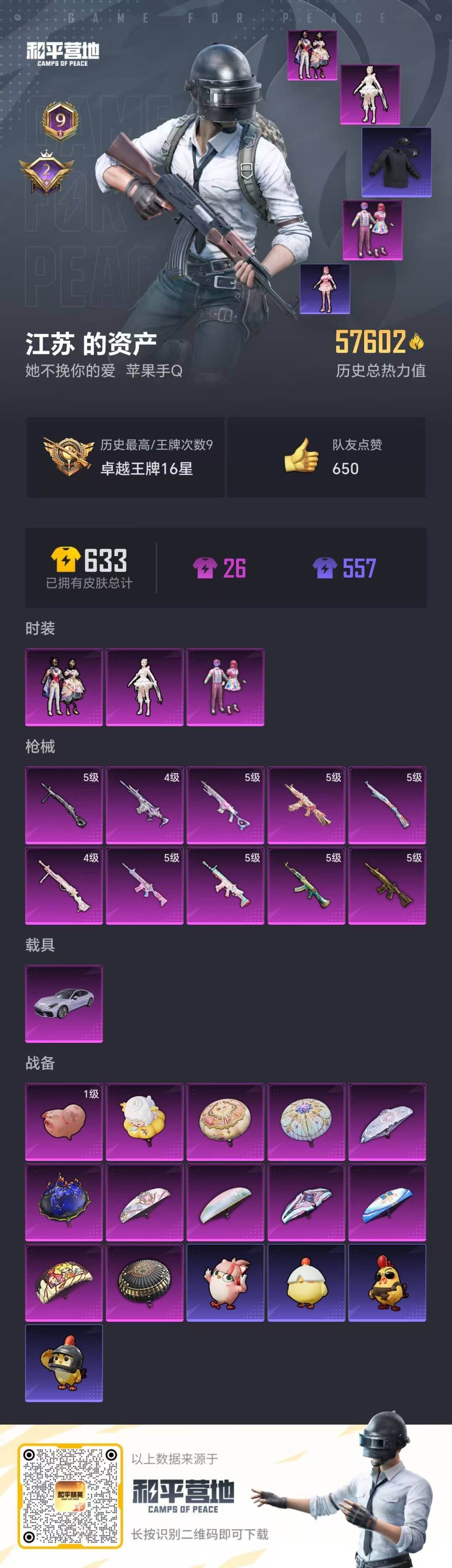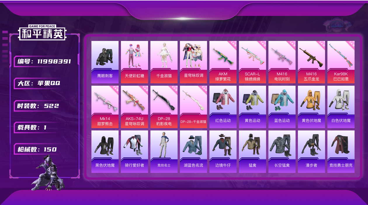 [11998391]3粉装 10特效枪 1载具 9印记 可二次 可修改实名 优质装备:M416五爪金龙,天使彩虹糖,AKM绿萝繁花,SCAR-L-锦绣绵绵,M416电玩时刻,DP-28-千金淑猫,千金淑猫,星穹咏叹调,AKS-74U-星穹咏叹调,MK14-甜梦熊击,Kar98K-巳巳如意 热门装扮:鹰眼刺客 稀有枪皮:DP-28-豹影疾电 五级特效枪:五级M416-五爪金龙,五级Kar98K-巳巳如意,五级DP-28-豹影疾电,五级MK14-甜梦熊击,五级AKS-74U-星穹咏叹调,五级M416-电玩时刻,五级SCAR-L-锦绣绵绵,五级AKM-绿萝繁花 四级特效枪:四级DP-28-千金淑猫 紫色装扮:SS30特训套装,SS31特训套装,云朵鹅,彩虹兔,雪绒豹,SS33特训套装,旭日情侣,SS21特训,顶瓜瓜,冷焰舞者,北国孤狼,坚韧舞者,夏日音浪,夜莺强袭者,幻世战舞者,幻影武者,冰川特警,SS2特训,SS3特训,SS5特训,天籁歌者,SS17特训,SS14特训,SS20特训,怒火燎原,SS18特训,浓情蜜辣,飞驰魅影,音速流光,SS19特训,战地菁英,飞行日记,骑行爱好者,魅力单车,黄色伏地魔,黄色运动,黑色伏地魔,龙的传人,龙魂突击队,蝶变,跃动心情,边境牛仔,都市漫游者,野性战魂,长空猛禽,雨林探路者,雪山精英,西部牛仔,熔岩游骑兵连帽夹克,蓝海鲸歌,街头潮人,海滨突袭者,湖蓝色名流,灰色格斗者,灼焰舞者,热血青春,牛气冲天,牛气满满,海岛探路者,探宝勇士,格斗先锋,血色贵族,红色运动,绮丽涂鸦,缤纷果语,耀眼新星,蓝彩潮人,蓝色守护者,蓝色运动,竞技勇士朋克,猛禽,甜蜜告白,空岛之星,疯狂小兔子,白色伏地魔,破晓战魂,SS29特训,SS28特训,鱼渊荷华,燕燕于飞,巳巳如意,森林游猎者,海琴烟,风玲,智谋强哥,异域银装,青团波波,糖糖葫芦,竞技名士,深海梦境,惊鸿侠骨,神气柴柴,SS24特训(SS24特训套装),SS25特训,锦衣飞扬,SS27特训,焰鹰斗篷,幻羽潜行,Alan Walker,湖雨初晴,情公主,浪漫天命,SS26特训,SS7特训,SS9特训,SS6特训,SS12特训,SS13特训,SS11特训,耀粉歌者,粉甜马卡龙,大橘大利,星影赞美诗,SS32特训服(SS32特训套装),蓝冰羽,绯格组合,紫幽梦,恋语绒绒,漫步者,冰冻风暴 优质战备:精灵梦叶罗丽降落伞,莲影