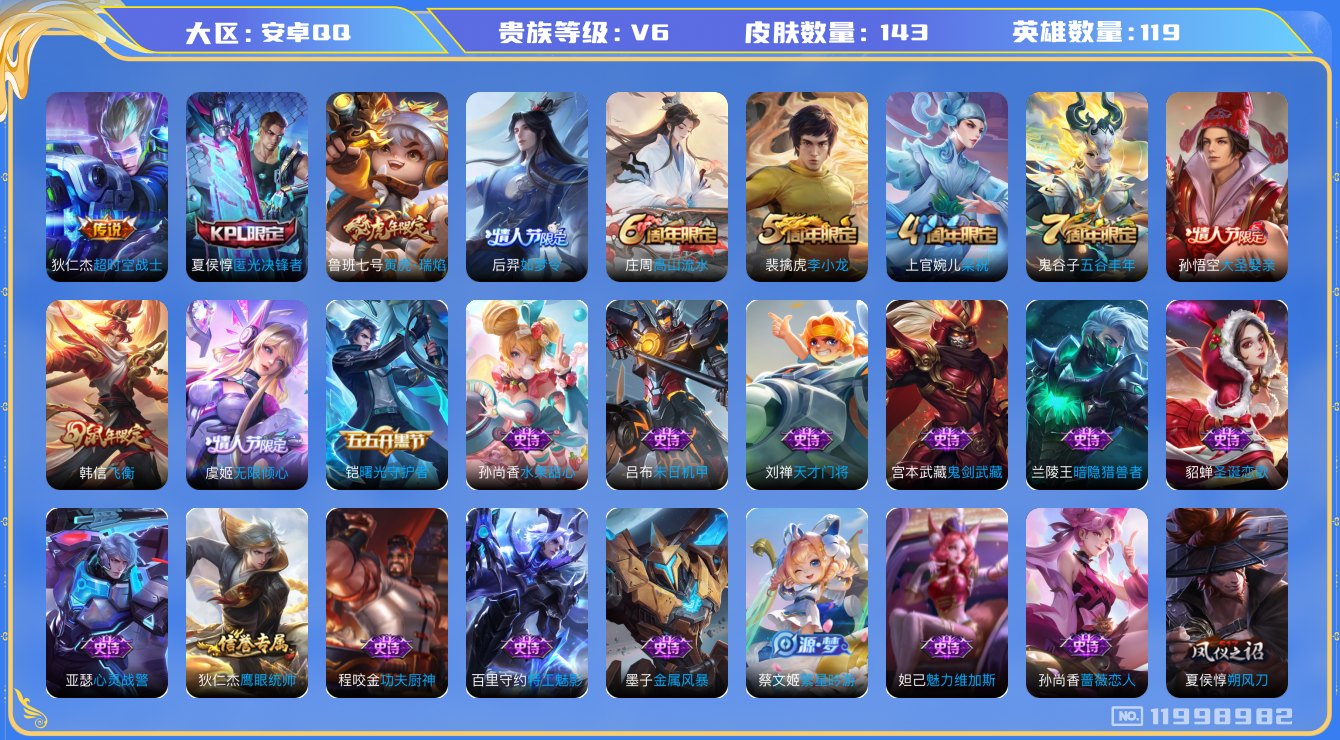 [11998982]V6 3传说 119英雄 143皮肤 可修改实名 优质装备:超时空战士-狄仁杰 珍宝阁皮:蔷薇恋人 限定皮:飞衡(韩信年限),高山流水,无限倾心-虞姬,匿光决锋者,五谷丰年,梁祝,李小龙,如梦令-后羿,大圣娶亲,寅虎·瑞焰(虎皮蛋子) 史诗皮:特工魅影,末日机甲-吕布,水果甜心,天才门将,功夫厨神,暗隐猎兽者,鬼剑武藏,心灵战警,繁星吟游(呼啦呼啦),曙光守护者,金属风暴,圣诞恋歌,鹰眼统帅,魅力维加斯