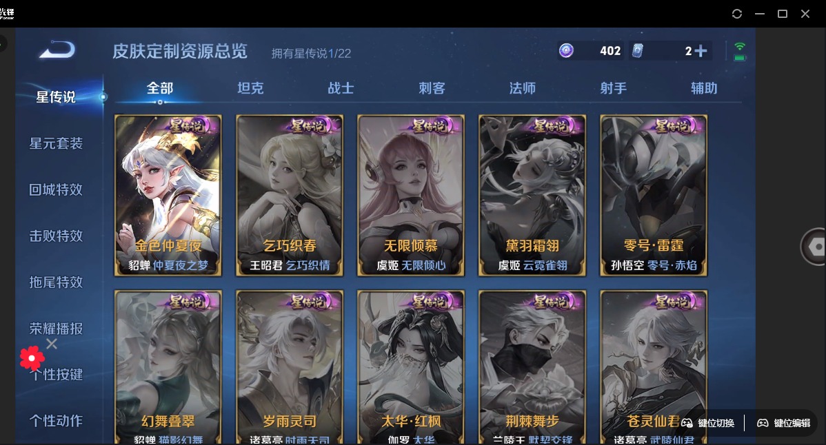 项羽霸王别姬,吕布御风骁将,后羿如梦令,诸葛亮时雨天司,兰陵王默契交锋,裴擒虎李小龙,东皇太一逐梦之光,上官婉儿梁祝,马可波罗逐梦之星,孙悟空大圣娶亲,孙悟空至尊宝,虞姬霸王别姬,关羽冰锋战神