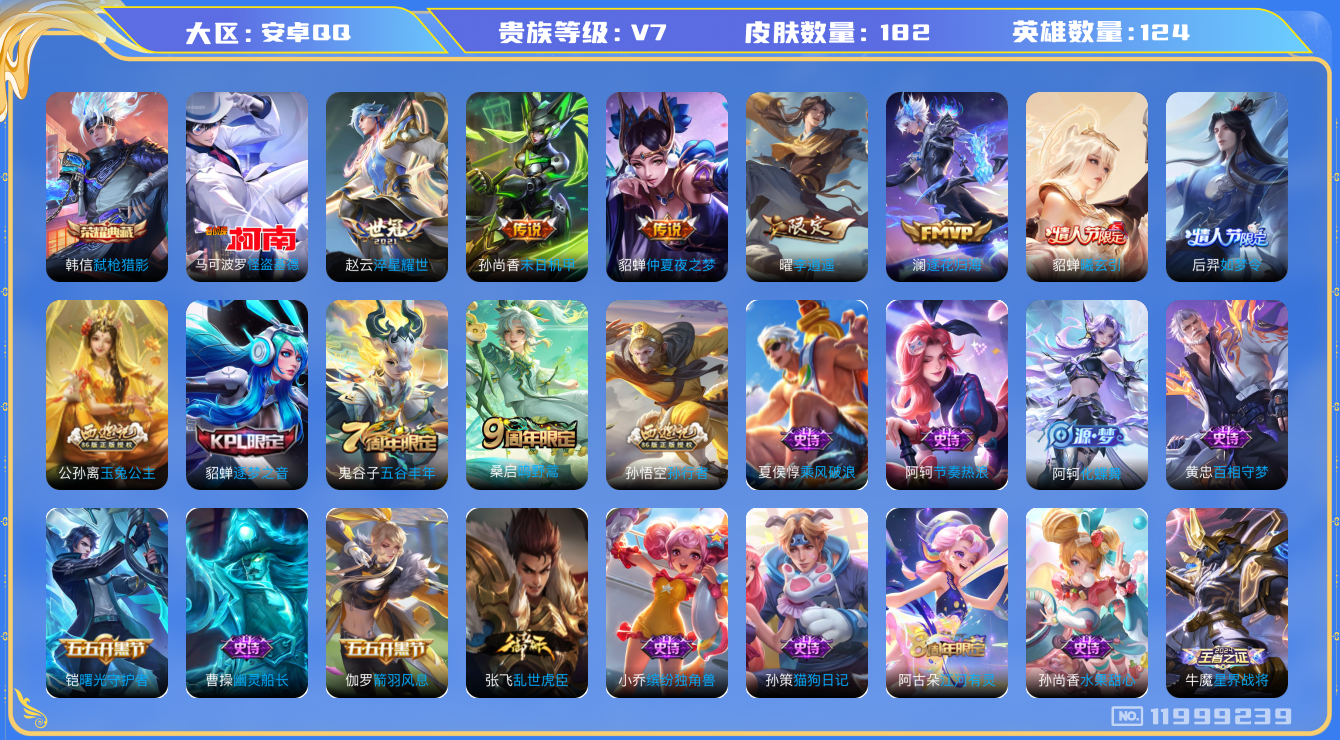 [11999239]V7 1典藏 1珍品传说 7传说 124英雄 182皮肤 可修改实名 优质装备:弑枪猎影(韩信典藏),怪盗基德,末日机甲-孙尚香(绿蚂蚱),仲夏夜之梦(大飞蛾),李逍遥,淬星耀世,澜逐花归海 传说皮:貂蝉曦玄引 珍宝阁皮:女武神,玩趣恶龙 限定皮:鸣野蒿,五谷丰年,逐梦之音,如梦令-后羿,孙行者,玉兔公主 史诗皮:化蝶舞,星界战将,百相守梦-周瑜,涂山红红,东方月初,百相守梦-百里守约,百相守梦-黄忠,紫霞仙子,苍穹之光,特工魅影,千年之狐,江河有灵,蒙恬荣光圣徽,冰冠公主,偶像歌手,电玩·爆裂旋风,猫狗日记-孙策,乱世虎臣,节奏热浪,女仆咖啡,摇滚巨星,水果甜心,心灵骇客,暗隐猎兽者,幽灵船长,鬼剑武藏,心灵战警,天秀·启明,纤云弄巧,缤纷独角兽,乘风破浪,逐浪之夏,水晶猎龙者,曙光守护者,箭羽风息,唤灵魅影,金属风暴,原初追逐者,圣诞狂欢,圣诞恋歌,鹰眼统帅,暗夜贵公子,赏金猎手,无心,未来纪元-赵云