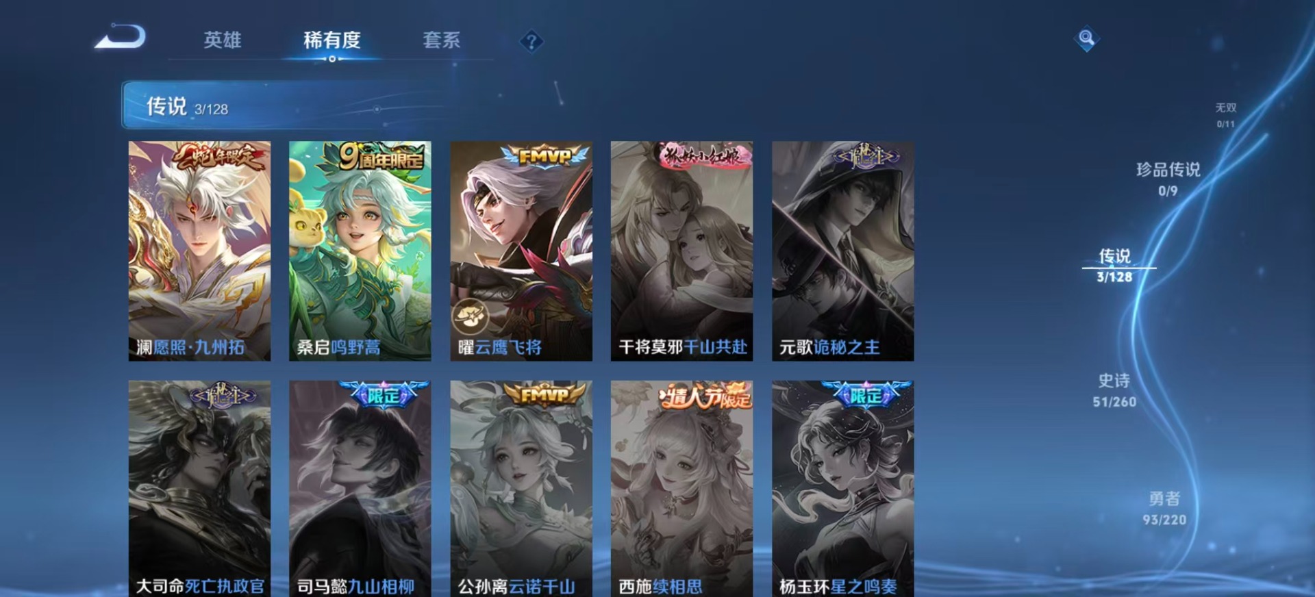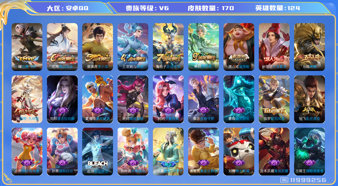 [11999256]V6 3传说 124英雄 170皮肤 可修改实名 优质装备:云鹰飞将(小将军),涂山容容 珍宝阁皮:胡桃夹子 限定皮:愿照·九州拓(澜年限),鸣野蒿,神威(电光马子),高山流水,五谷丰年,梁祝,李小龙,猪悟能,大圣娶亲 史诗皮:器灵·浮梦炉,龙之律动,石田雨龙,破空之剑,百相守梦-黄忠,黄金分割率,特工魅影,千年之狐,冰冠公主,暗夜猫娘,猫狗日记-孙策,乱世虎臣,节奏热浪,修罗,女仆咖啡,摇滚巨星,水果甜心,绅士熊喵,星夜王子,德古拉伯爵,暗隐猎兽者,幽灵船长,鬼剑武藏,纤云弄巧,繁星吟游(呼啦呼啦),拒霜思,缤纷独角兽,乘风破浪,逐浪之夏,水晶猎龙者,箭羽风息,金属风暴,圣诞恋歌,鹰眼统帅,魅力维加斯,未来纪元-赵云