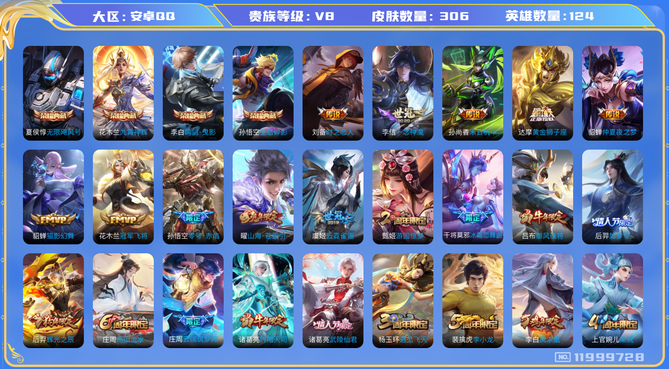 [11999728]V8 4典藏 17传说 124英雄 306皮肤 可修改实名 优质装备:无限飓风号(高达),鸣剑·曳影,全息碎影(猴子典藏),九霄神辉(木兰典藏),黄金狮子座,冠军飞将,猫影幻舞,一念神魔,云霓雀翎,末日机甲-孙尚香(绿蚂蚱),仲夏夜之梦(大飞蛾),零号·赤焰,时之恋人-刘备(电焊工),山海·苍雷引(电光曜子) 珍宝阁皮:妄想食味,优雅恋人 限定皮:愿照·岁时盈(虞姬年限),至尊宝,白虎志(电光耗子),凤求凰(白切鸡),武陵仙君(小桃花),时之彼端,白晶晶,时雨天司(水龙头),神威(电光马子),飞衡(韩信年限),瑞麟志(木兰年限),遇见飞天,高山流水,诗剑行,冰锋战神,游园惊梦,梁祝,御风骁将(吕布年限),逐梦之星,天狼绘梦者,李小龙,辉光之辰,如梦令-后羿,霸王别姬-虞姬,默契交锋-花木兰,孙行者,大圣娶亲,青春决赛季,冰霜恋舞曲,云端筑梦师 史诗皮:百相守梦-黄忠,紫霞仙子,苍穹之光,电玩小子(小书包),白龙吟,黄金分割率,特工魅影,千年之狐,永昼,魅语,无限星赏官,偶像歌手,暗夜猫娘,猫狗日记-孙策,乱世虎臣,节奏热浪,修罗,女仆咖啡,水果甜心,天才门将,星夜王子,心灵骇客,时之奇旅-安琪拉,功夫厨神,德古拉伯爵,暗隐猎兽者,幽灵船长,鬼剑武藏,心灵战警,舞动绿茵,地狱岩魂,纤云弄巧,繁星吟游(呼啦呼啦),拒霜思,缤纷独角兽,乘风破浪,逐浪之夏,月团寄思,水晶猎龙者,曙光守护者,箭羽风息,金属风暴,原初追逐者,圣诞狂欢,圣诞恋歌,鹰眼统帅,魅力维加斯,未来纪元-赵云