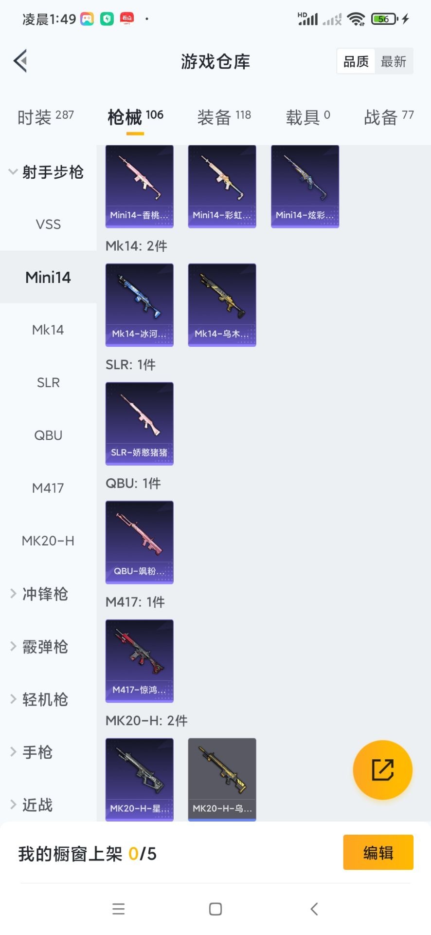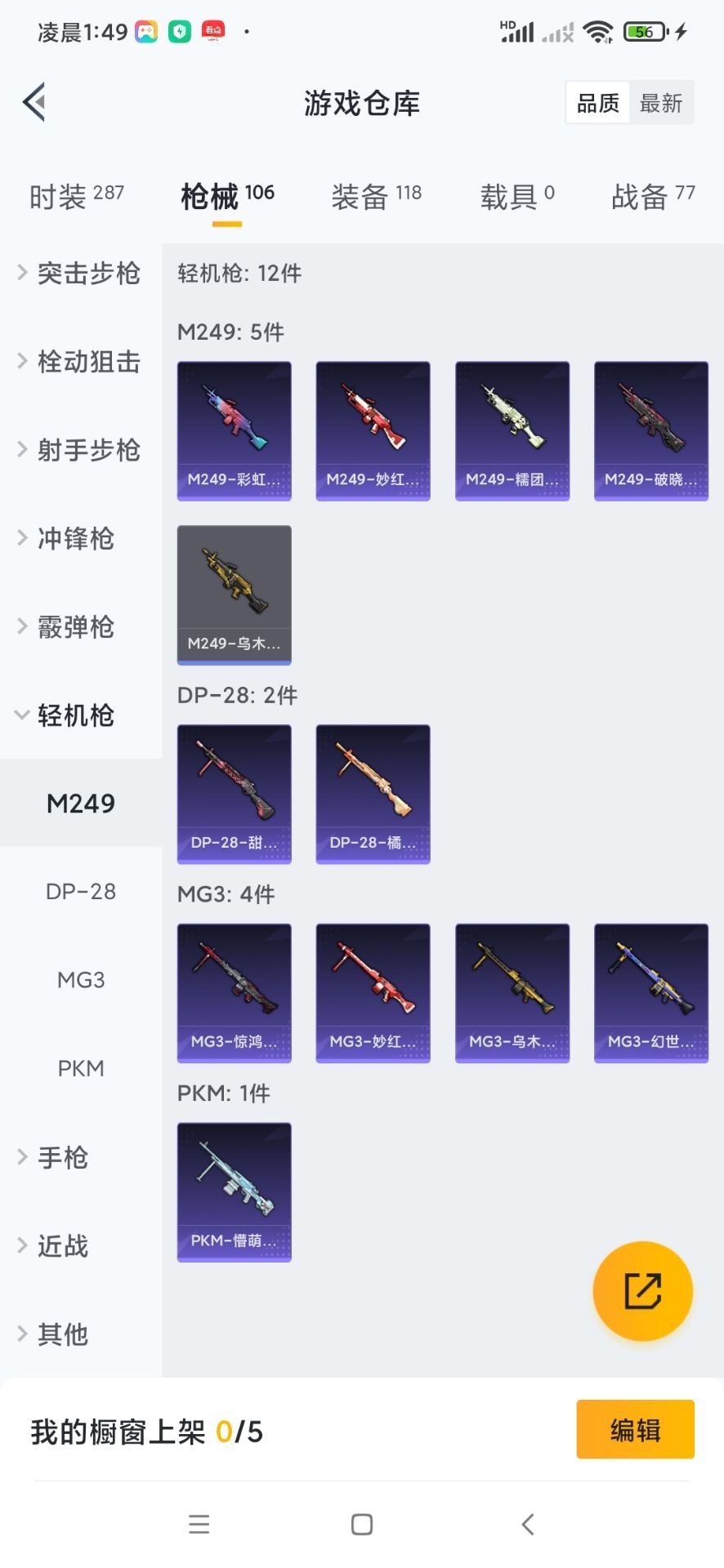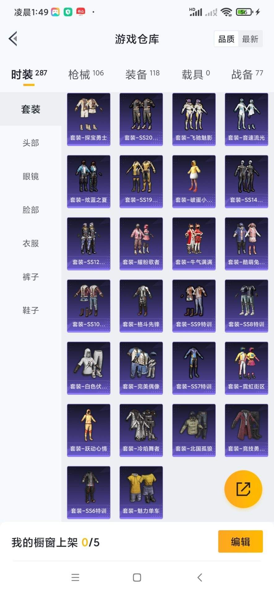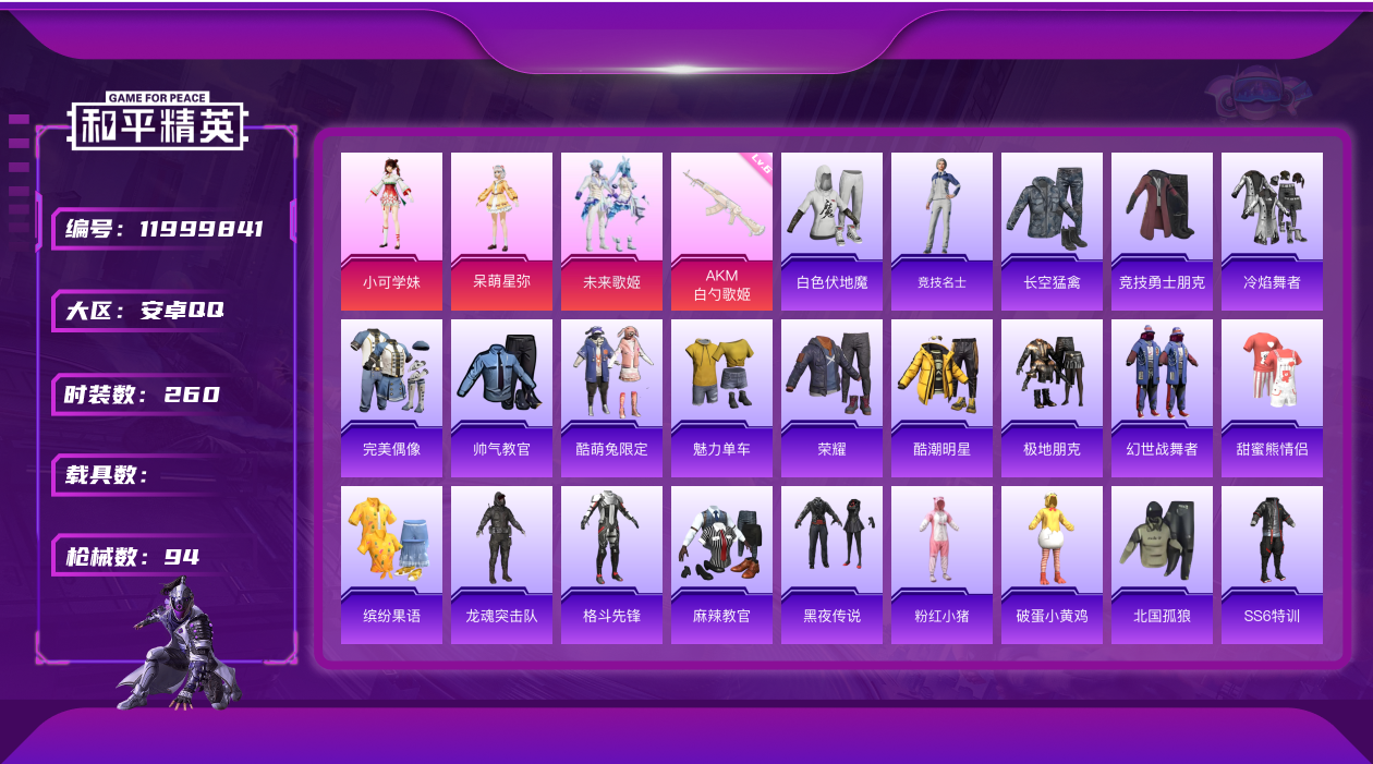- PX_2094696- 安卓手Q-17王牌印记-6粉装-4特效枪-0载具-70795热力值-188套装-236枪皮-3卓越印记-0传奇印记 【6粉装】,初号机款机体服,星穹咏叹调,未来领航者,圣堂之誓,绚金战神,音爆索尼克 【4特效枪】M416-心之恋语-7级 Kar98K-巳巳如意-5级 Mk14-甜梦熊击-5级 SPAS-12-蜜语绒猫-7级 【6稀有紫装】,暗影哥特,浪漫天命,雪山精英,明