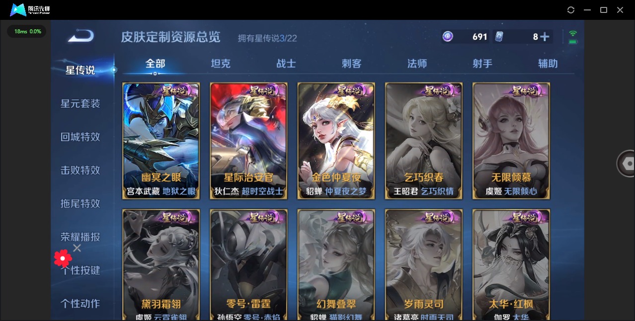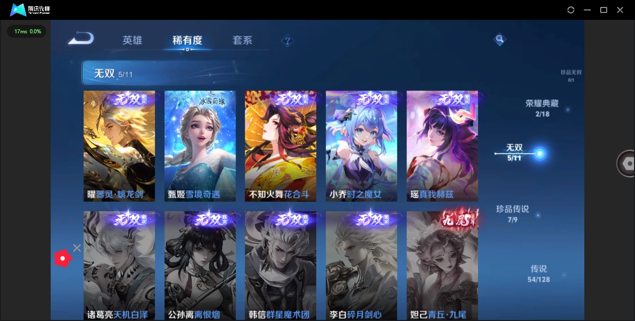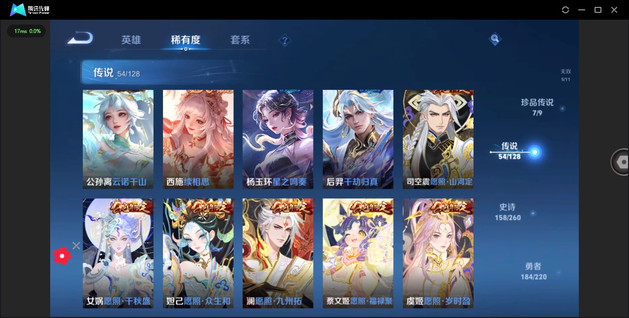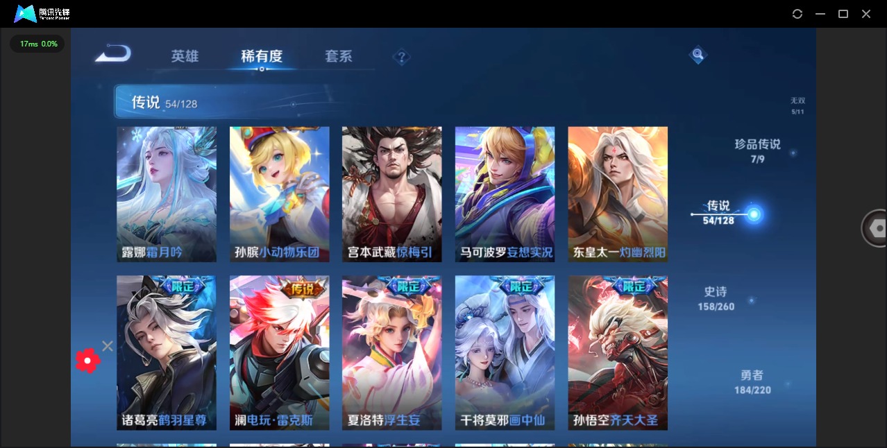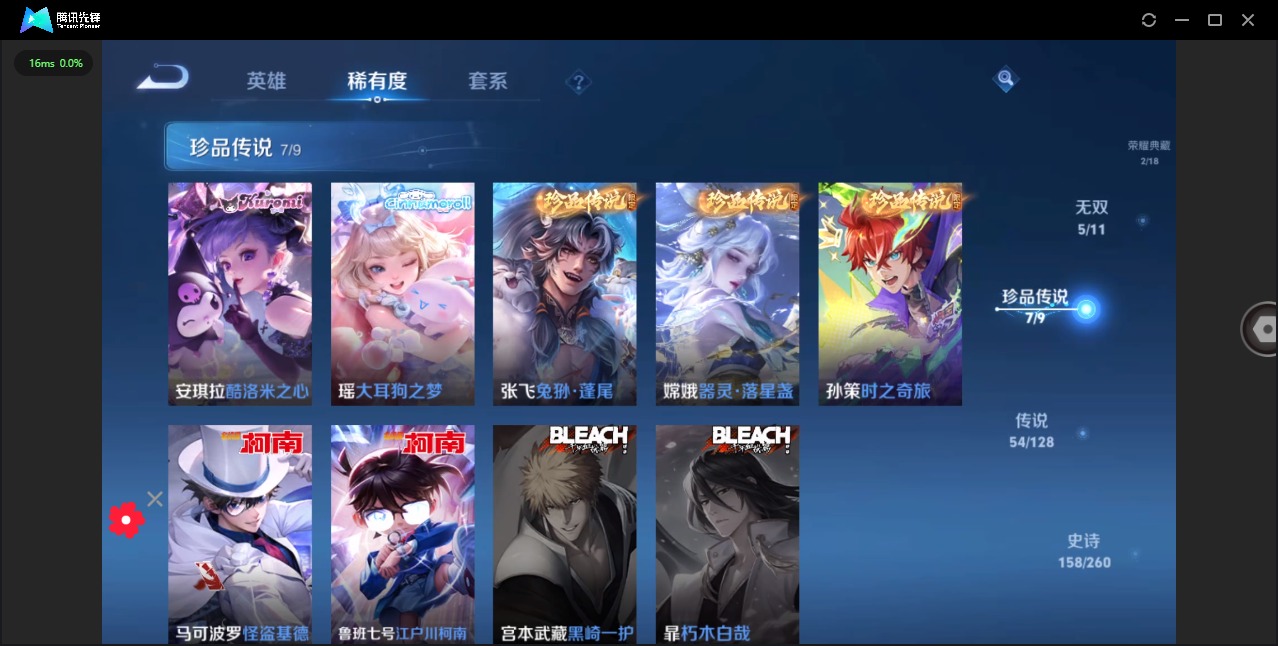 - [11351057]V8 1典藏 1珍品传说 17传说 125英雄 316皮肤 可修改实名 优质装备:鸣剑·曳影,怪盗基德,黄金狮子座,冠军飞将,久胜战神,云霓雀翎,末日机甲-孙尚香(绿蚂蚱),地狱火,零号·赤焰,地狱之眼 传说皮:乘龙·淬吴钩(孙策年限),死亡执政官,九山相柳,幻光神枪 珍宝阁皮:妄想食味,蔷薇恋人,玩趣恶龙 限定皮:愿照·九州拓(澜年限),逐霄战戟,鸣野蒿,白虎志(电光耗子),时雨天司(水龙头),神威(电光马子),飞衡(韩信年限),瑞麟志(木兰年限),遇见飞天,高山流水,五谷丰年,青龙志(铠年限),梁祝,天狼狩猎者,岱宗(典韦年限),李小龙,孙行者,猪悟能 史诗皮:器灵·浮梦炉,化蝶舞,星界战将,龙之律动,百相守梦-周瑜,茶境仙,破空之剑,蒙犽顽岩魄,蔬乡物语(鲁班七号),百相守梦-百里守约,百相守梦-黄忠,紫霞仙子,苍穹之光,电玩小子(小书包),特工魅影,千年之狐,江河有灵,雪夜绮愿(周瑜),百解令(蒙犽),高渐离燃音魔法,蒙恬荣光圣徽,冰冠公主,青蛇,偶像歌手,电玩·爆裂旋风,百相守梦(刘备),暗夜猫娘,末日机甲-吕布,猫狗日记-孙策,乱世虎臣,节奏热浪,修罗,女仆咖啡,摇滚巨星,水果甜心,星夜王子,心灵骇客,功夫厨神,德古拉伯爵,暗隐猎兽者,幽灵船长,鬼剑武藏,心灵战警,乐园奇幻夜,天秀·启明,舞动绿茵,地狱岩魂,纤云弄巧,拒霜思,乘风破浪,逐浪之夏,水晶猎龙者,曙光守护者,箭羽风息,金属风暴,原初追逐者,圣诞恋歌,鹰眼统帅,魅力维加斯,黎明之约,赏金猎手,无心,未来纪元-赵云