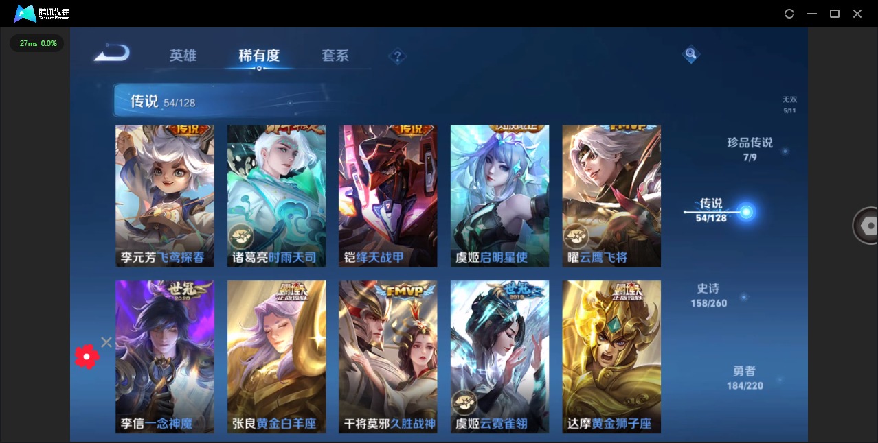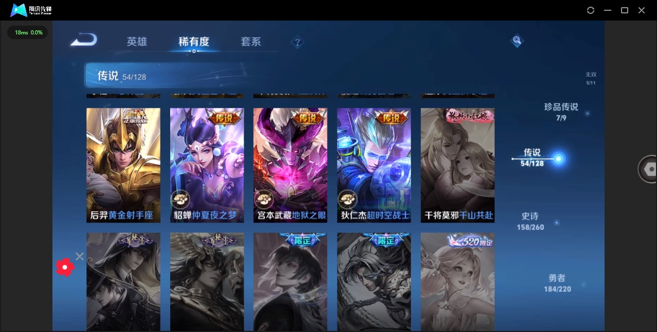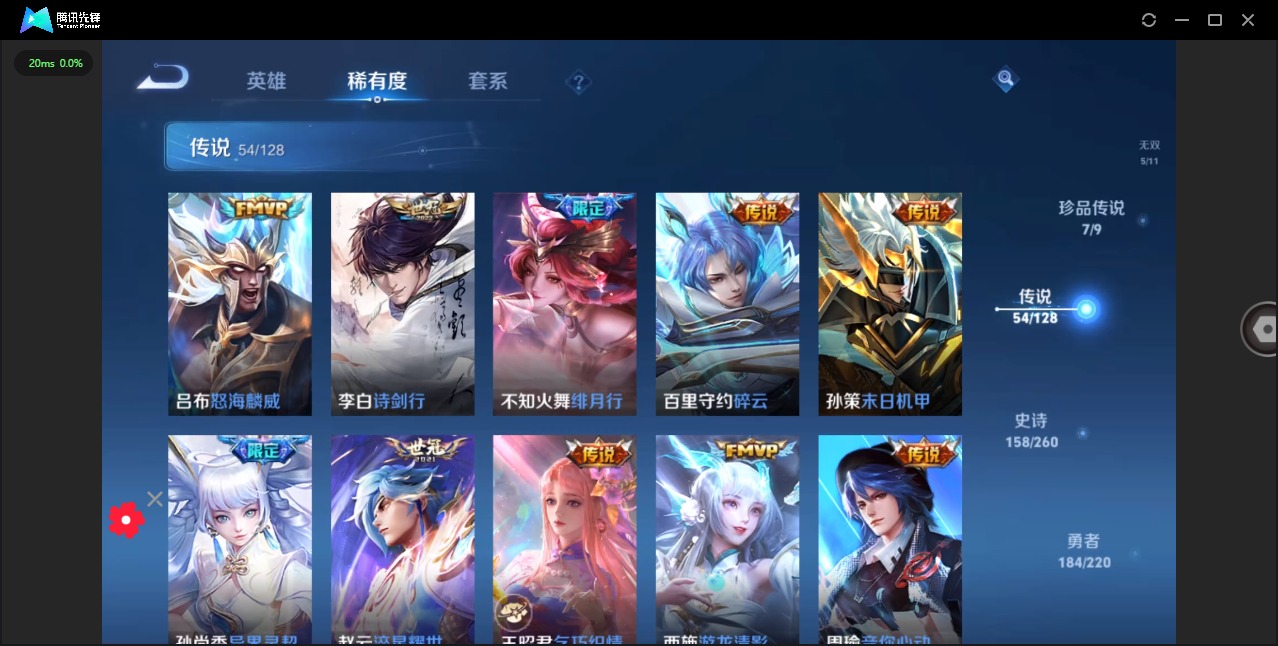 - [11684528]V8 1典藏 12传说 124英雄 219皮肤 可修改实名 优质装备:鸣剑·曳影,黄金狮子座,冠军飞将,末日机甲-孙尚香(绿蚂蚱),地狱火,零号·赤焰,地狱之眼,超时空战士-狄仁杰 珍宝阁皮:万物之道,优雅恋人 限定皮:至尊宝,凤求凰(白切鸡),梅西,武陵仙君(小桃花),时雨天司(水龙头),冰锋战神,游园惊梦,梁祝,天狼绘梦者,李小龙,逐梦之影,永曜之星,辉光之辰,大圣娶亲,引擎之心,冰霜恋舞曲 史诗皮:紫霞仙子,电玩小子(小书包),白龙吟,黄金分割率,特工魅影,千年之狐,真我赫兹(百里守约),冰冠公主,末日机甲-吕布,乱世虎臣,节奏热浪,修罗,摇滚巨星,水果甜心,天才门将,星夜王子,心灵骇客,功夫厨神,德古拉伯爵,暗隐猎兽者,幽灵船长,鬼剑武藏,心灵战警,舞动绿茵,地狱岩魂,纤云弄巧,缤纷独角兽,逐浪之夏,水晶猎龙者,曙光守护者,金属风暴,圣诞狂欢,圣诞恋歌,鹰眼统帅,暗夜贵公子,魅力维加斯,未来纪元-赵云