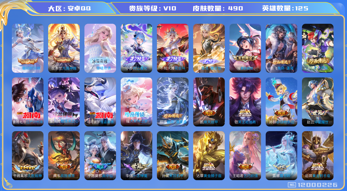 [12000226]V10 2典藏 5无双 7珍品传说 54传说 125英雄 490皮肤 可修改实名 优质装备:九霄神辉(木兰典藏),真我赫兹(瑶)(瑶无双),小乔时之魔女(小乔无双),花合斗,雪境奇遇-甄姬,器灵·螭龙剑,最初的交响(伽罗典藏),江户川柯南,怪盗基德,器灵·落星盏,酷洛米之心,大耳狗之梦,黄金狮子座,黄金射手座,云鹰飞将(小将军),绛天战甲(鸡嘴战神),黄金白羊座,久胜战神,一念神魔,云霓雀翎,仲夏夜之梦(大飞蛾),地狱之眼,飞鸢探春,音你心动-周瑜,乞巧织情,游龙清影(小青龙),淬星耀世,超时空战士-狄仁杰,末日机甲-孙策,碎云,画中仙,浮生妄,电玩·雷克斯,鹤羽星尊,灼幽烈阳,妄想实况,惊梅引,小动物乐团,霜月吟,澜逐花归海,艾琳觅芳踪,牧神诗旅,玄雷天君,千劫归真 珍品传说:时之奇旅-孙策,兔狲·蓬尾 传说皮:典韦战鼓燎原,云诺千山,铠冥王哈迪斯,续相思,星之鸣奏,祥瑞亨通,幻光神枪 珍宝阁皮:妄想食味,胡桃夹子,女武神 限定皮:愿照·九州拓(澜年限),愿照·福禄聚(蔡文姬年限),愿照·岁时盈(虞姬年限),愿照·山河定(司空震年限),愿照·众生和(妲己年限),愿照·千秋盛(女娲年限),逐霄战戟,映山客,陌上桑,鸣野蒿,至尊宝,异界灵契(白毛香),傲雪梅枪,绯月行,时之彼端,魔法小厨娘,时雨天司(水龙头),神威(电光马子),高山流水,诗剑行,齐天大圣,怒海麟威,降魔,五谷丰年,青龙志(铠年限),冰锋战神,梁祝,御风骁将(吕布年限),烈魂,岱宗(典韦年限),天狼溯光者,虎魄,逐梦之音,李小龙,朱雀志(守约年限),孙行者,猪悟能,大圣娶亲,引擎之心,乒乒小将,蜜橘之夏,匿光追影者,神器·万象笔,山海·玄木吟(马可年限),冰霜神祇 史诗皮:鸭鸭历险记-刘禅,飞车小橘子,苍鳞隐世,器灵·浮梦炉,糖绘人间,狼魂孤将,绮世丹青,瑰影绮梦,化蝶舞,灵蛊蚀心,星界战将,谪仙醉月,龙之律动,雪豹·霜爪,藏狐·褐绒,布丁狗之誓,石田雨龙,茶境仙,怒海争锋,炽弈燎原,破空之剑,战舞者,涂山红红,东方月初,蒙犽顽岩魄,埋骨钱,芈月浮光幕影,海诺心动手记,夜落电台,决胜骁骑,百相守梦-百里守约,星界特工,百相守梦-黄忠,遇见神鹿,紫霞仙子,苍穹之光,电玩小子(小书包),白龙吟,黄金分割率,特工魅影,千年之狐,永昼,匿光侦查者,末日机甲-莱西奥,真我赫兹(百里守约),完美假期,闲日渔趣,