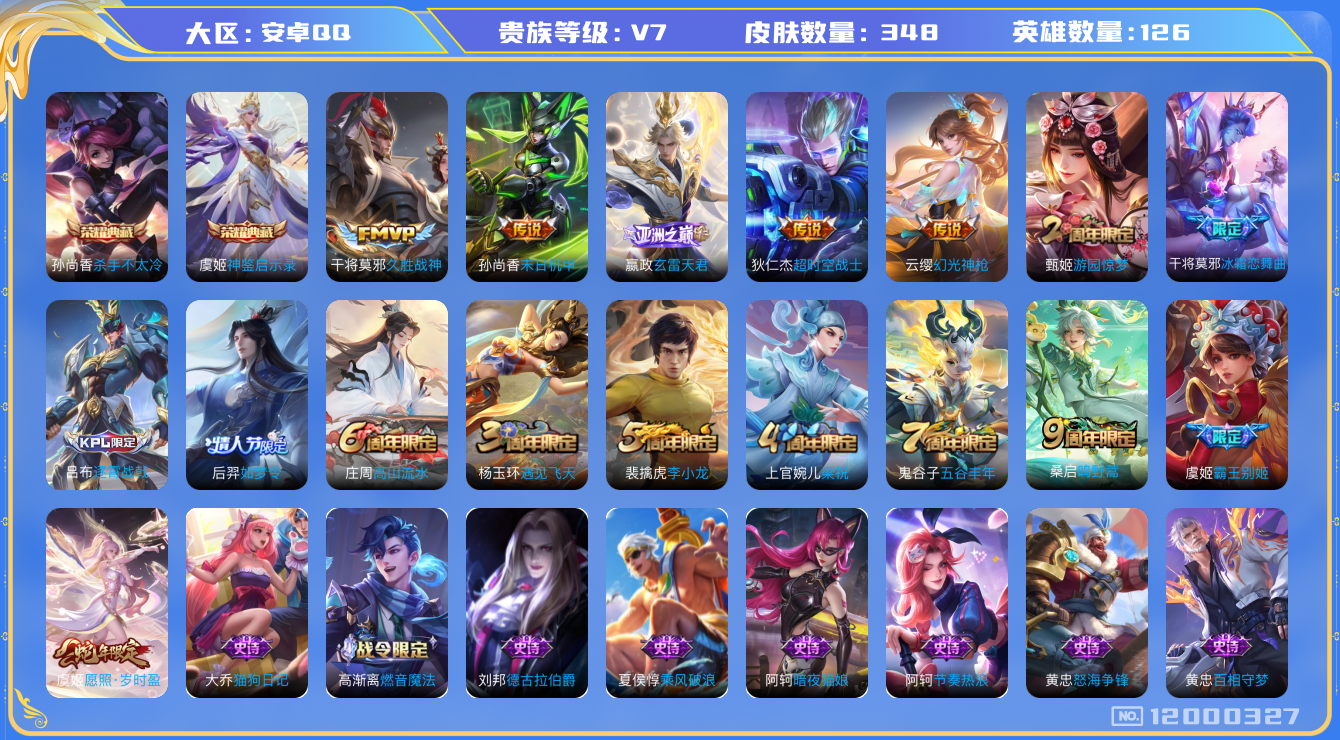 [12000327]V7 2典藏 7传说 126英雄 348皮肤 典藏英雄武则天 可修改实名 优质装备:杀手不太冷,神鉴启示录,久胜战神,末日机甲-孙尚香(绿蚂蚱),超时空战士-狄仁杰,玄雷天君,涂山容容 传说皮:幻光神枪 珍宝阁皮:妄想食味,优雅恋人,蔷薇恋人,女武神 限定皮:愿照·岁时盈(虞姬年限),逐霄战戟,鸣野蒿,遇见飞天,高山流水,五谷丰年,游园惊梦,梁祝,李小龙,如梦令-后羿,霸王别姬-虞姬,冰霜恋舞曲 史诗皮:鸭鸭历险记-刘禅,器灵·浮梦炉,灵蛊蚀心,星界战将,龙之律动,石田雨龙,怒海争锋,蔬乡物语(鲁班七号),百相守梦-百里守约,百相守梦-黄忠,紫霞仙子,苍穹之光,电玩小子(小书包),白龙吟,黄金分割率,特工魅影,千年之狐,永昼,江河有灵,魅语,高渐离燃音魔法,蒙恬荣光圣徽,偶像歌手,暗夜猫娘,龙骑士(小龙虾),末日机甲-吕布,猫狗日记-孙策,猫狗日记-大乔,时之恋人-孙尚香,乱世虎臣,节奏热浪,女仆咖啡,摇滚巨星,水果甜心,绅士熊喵,天才门将,星夜王子,心灵骇客,功夫厨神,德古拉伯爵,暗隐猎兽者,幽灵船长,鬼剑武藏,心灵战警,天秀·启明,舞动绿茵,地狱岩魂,纤云弄巧,繁星吟游(呼啦呼啦),拒霜思,缤纷独角兽,乘风破浪,逐浪之夏,月团寄思,水晶猎龙者,曙光守护者,箭羽风息,金属风暴,原初追逐者,圣诞狂欢,圣诞恋歌,鹰眼统帅,暗夜贵公子,魅力维加斯,黎明之约,无心,未来纪元-赵云