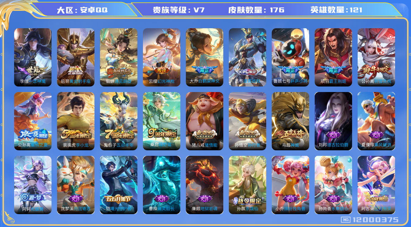 [12000375]V7 6传说 121英雄 176皮肤 可修改实名 优质装备:黄金射手座,一念神魔,遇见胡旋,涂山容容 传说皮:幻光神枪 珍宝阁皮:万物之道,女武神 限定皮:逐霄战戟,鸣野蒿,白鹤梁神女,神威(电光马子),五谷丰年,祈雪灵祝(雪兔子),李小龙,霸王别姬-项羽,孙行者,猪悟能,乒乒小将,蜜橘之夏 史诗皮:飞车小橘子,化蝶舞,星界战将,茶境仙,特工魅影,千年之狐,江河有灵,百解令(蒙犽),蒙恬荣光圣徽,冰冠公主,偶像歌手,晚萤,电玩·爆裂旋风,末日机甲-吕布,修罗,女仆咖啡,摇滚巨星,水果甜心,星夜王子,功夫厨神,德古拉伯爵,暗隐猎兽者,幽灵船长,鬼剑武藏,地狱岩魂,拒霜思,缤纷独角兽,乘风破浪,逐浪之夏,月团寄思,水晶猎龙者,曙光守护者,热力回旋,金属风暴,圣诞恋歌,鹰眼统帅,魅力维加斯,黎明之约,未来纪元-赵云