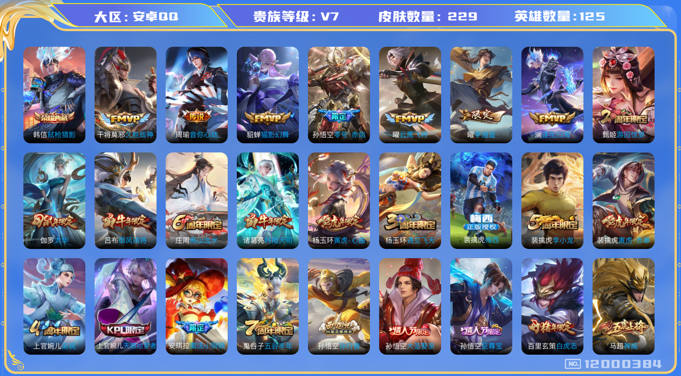 [12000384]V7 1典藏 11传说 125英雄 229皮肤 可修改实名 优质装备:弑枪猎影(韩信典藏),云鹰飞将(小将军),猫影幻舞,久胜战神,零号·赤焰,音你心动-周瑜,李逍遥,澜逐花归海,涂山容容 珍宝阁皮:女武神,玩趣恶龙 限定皮:至尊宝,白虎志(电光耗子),太华(伽罗年限),梅西,傲雪梅枪,魔法小厨娘,时雨天司(水龙头),神威(电光马子),遇见飞天,高山流水,五谷丰年,游园惊梦,梁祝,御风骁将(吕布年限),天狼绘梦者,李小龙,朱雀志(守约年限),孙行者,大圣娶亲,寅虎·心曲(虎婆),寅虎·赤拳(老虎年限) 史诗皮:灵蛊蚀心,百相守梦-黄忠,织梦人,遇见神鹿,电玩小子(小书包),白龙吟,永昼,江河有灵,魅语,百解令(蒙犽),蒙恬荣光圣徽,无限星赏官,冰冠公主,猫狗日记-孙策,猫狗日记-大乔,节奏热浪,修罗,水果甜心,星夜王子,时之奇旅-安琪拉,功夫厨神,德古拉伯爵,暗隐猎兽者,鬼剑武藏,心灵战警,纤云弄巧,繁星吟游(呼啦呼啦),缤纷独角兽,乘风破浪,逐浪之夏,龙鼓争鸣,水晶猎龙者,金属风暴,圣诞狂欢,圣诞恋歌,鹰眼统帅,无心,未来纪元-赵云