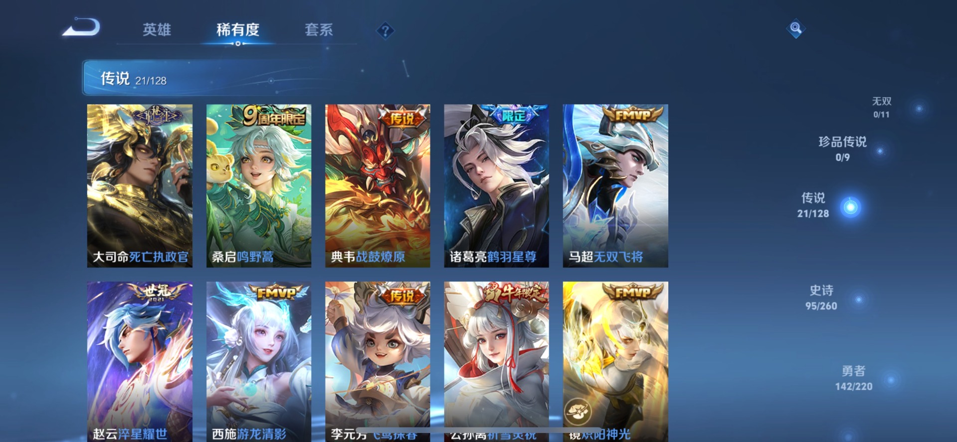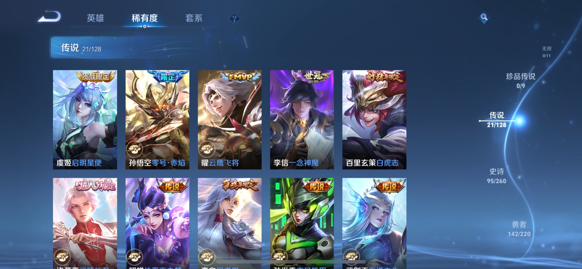- [11579330]V7 1典藏 8传说 124英雄 229皮肤 可修改实名 荣耀水晶:鸣剑·曳影 传说皮:云诺千山,幻光神枪,黄金白羊座,零号·赤焰,久胜战神 珍宝阁皮:妄想食味,玩趣恶龙 限定皮:愿照·山河定(司空震年限),逐霄战戟,鸣野蒿,时雨天司(水龙头),遇见飞天,五谷丰年 史诗皮:星界战将,茶境仙,器灵·浮梦炉,鸭鸭历险记-刘禅,龙之律动,百相守梦-百里守约,百相守梦-黄忠,蒙犽顽岩魄,蔬乡物语(鲁班七号),化蝶舞,破空之剑,紫霞仙子,特工魅影,千年之狐,江河有灵,高渐离燃音魔法,百解令(蒙犽),蒙恬荣光圣徽,冰冠公主,白蛇,暗夜猫娘,末日机甲-吕布,猫狗日记-大乔,节奏热浪,修罗,女仆咖啡,水果甜心,天才门将,星夜王子,心灵骇客,功夫厨神,德古拉伯爵,暗隐猎兽者,幽灵船长,鬼剑武藏,心灵战警,乐园奇幻夜,舞动绿茵,地狱岩魂,纤云弄巧,拒霜思,缤纷独角兽,逐浪之夏,水晶猎龙者,曙光守护者,金属风暴,原初追逐者,圣诞狂欢,鹰眼统帅,暗夜贵公子,黎明之约,未来纪元-赵云