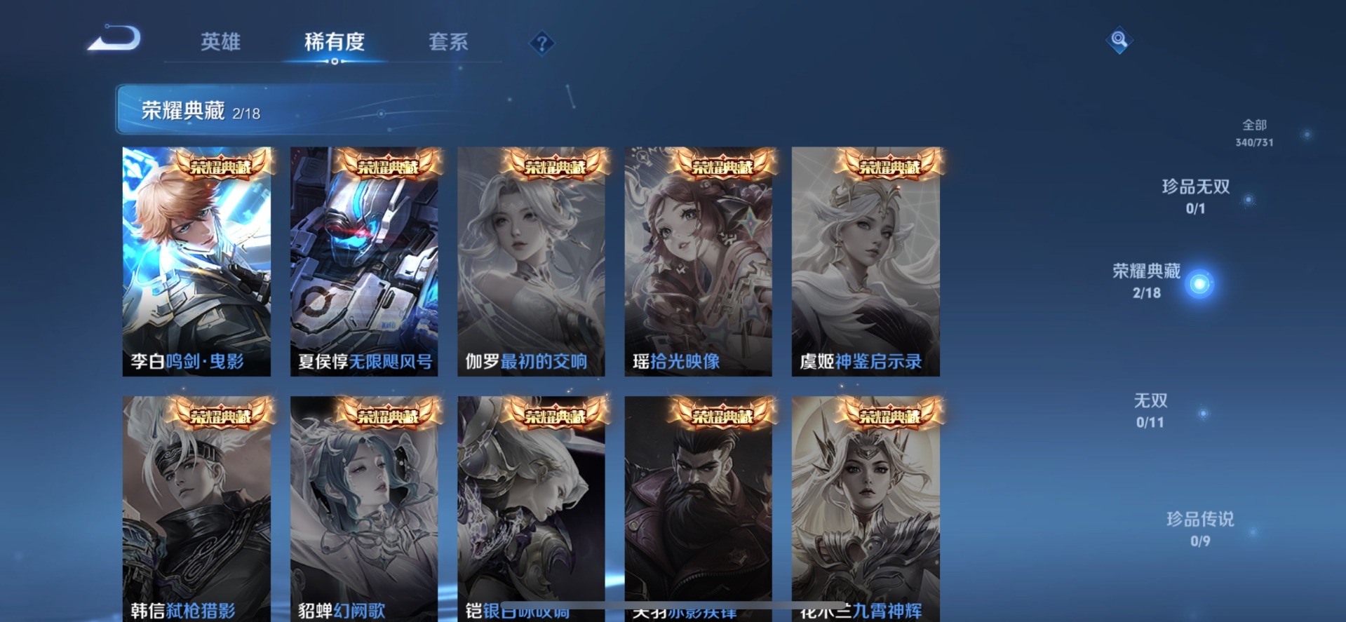 铠青龙志,伽罗天狼溯光者,后羿如梦令,镜匿光追影者,公孙离祈雪灵祝,公孙离玉兔公主,公孙离蜜橘之夏,裴擒虎李小龙,上官婉儿梁祝,花木兰默契交锋,桑启鸣野蒿,孙悟空孙行者,百里玄策白虎志,马超神威,韩信傲雪梅枪,韩信逐梦之影,百里守约朱雀志,蔡文姬奇迹圣诞
