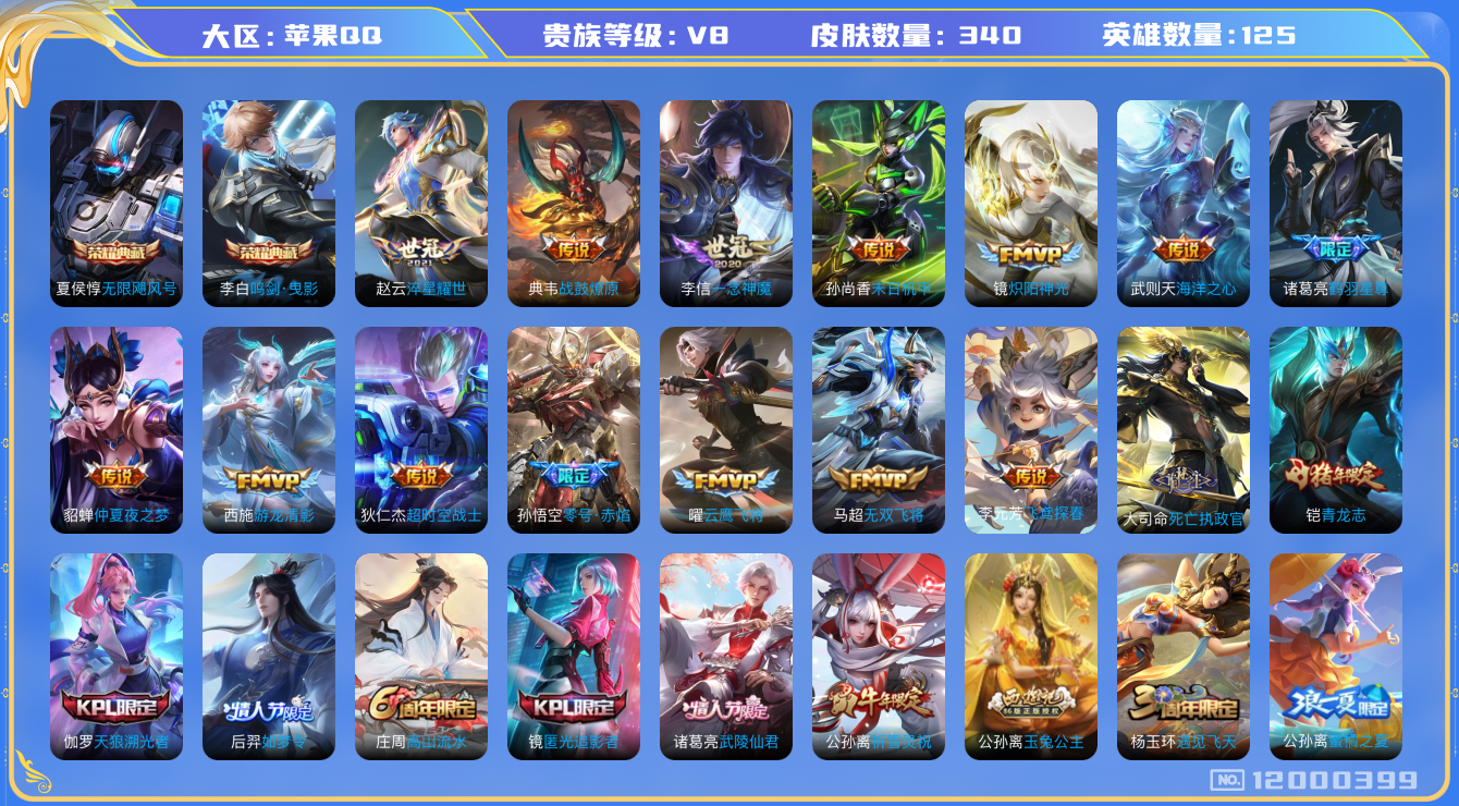 [12000399]V8 2典藏 21传说 125英雄 340皮肤 典藏英雄武则天 可修改实名 优质装备:无限飓风号(高达),鸣剑·曳影,云鹰飞将(小将军),炽阳神光,一念神魔,末日机甲-孙尚香(绿蚂蚱),仲夏夜之梦(大飞蛾),零号·赤焰,海洋之心,飞鸢探春,游龙清影(小青龙),淬星耀世,超时空战士-狄仁杰,无双飞将,鹤羽星尊 传说皮:典韦战鼓燎原,死亡执政官 珍宝阁皮:妄想食味,胡桃夹子,女武神 限定皮:鸣野蒿,白虎志(电光耗子),凤求凰(白切鸡),武陵仙君(小桃花),傲雪梅枪,神威(电光马子),遇见飞天,高山流水,五谷丰年,青龙志(铠年限),梁祝,天狼溯光者,祈雪灵祝(雪兔子),李小龙,逐梦之影,朱雀志(守约年限),如梦令-后羿,奇迹圣诞,默契交锋-花木兰,孙行者,蜜橘之夏,匿光追影者,玉兔公主 史诗皮:灵蛊蚀心,星界战将,龙之律动,百相守梦-周瑜,百相守梦-黄忠,织梦人,遇见神鹿,紫霞仙子,电玩小子(小书包),白龙吟,黄金分割率,特工魅影,千年之狐,江河有灵,魅语,蒙恬荣光圣徽,冰冠公主,偶像歌手,晚萤,末日机甲-吕布,猫狗日记-孙策,乱世虎臣,节奏热浪,修罗,女仆咖啡,摇滚巨星,水果甜心,绅士熊喵,天才门将,星夜王子,心灵骇客,时之奇旅-安琪拉,德古拉伯爵,暗隐猎兽者,幽灵船长,鬼剑武藏,暗渊魔法,心灵战警,天秀·启明,舞动绿茵,地狱岩魂,诗语江南,纤云弄巧,拒霜思,缤纷独角兽,乘风破浪,逐浪之夏,热力回旋,金属风暴,原初追逐者,圣诞狂欢,圣诞恋歌,鹰眼统帅,王者之锤,暗夜贵公子,魅力维加斯,黎明之约,赏金猎手,千筹问战