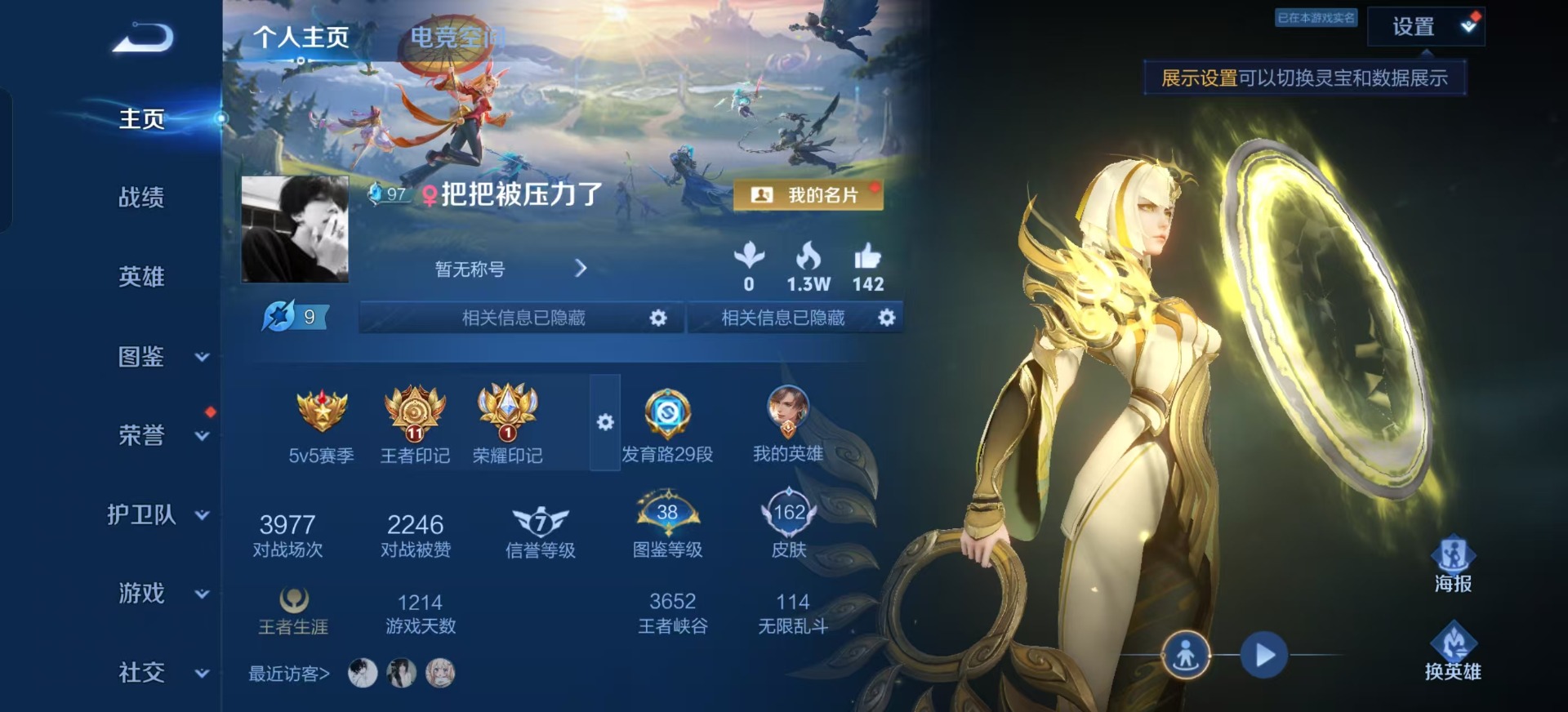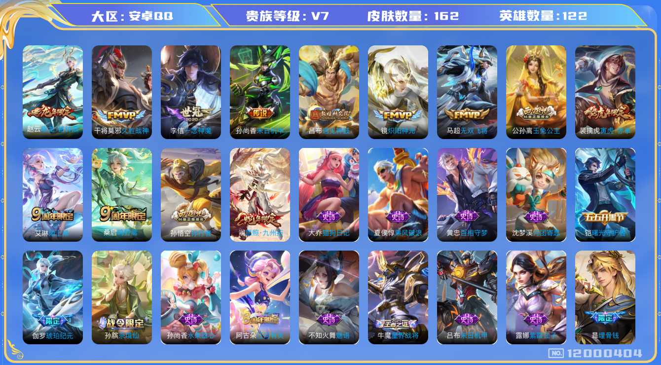 [12000404]V7 10传说 122英雄 162皮肤 可修改实名 优质装备:久胜战神,炽阳神光,一念神魔,末日机甲-孙尚香(绿蚂蚱),无双飞将,遇见神鼓 传说皮:乘龙·铭钟鼎(赵云年限) 珍宝阁皮:玩趣恶龙 限定皮:愿照·九州拓(澜年限),陌上桑,鸣野蒿,孙行者,寅虎·赤拳(老虎年限),玉兔公主 史诗皮:星界战将,龙之律动,茶境仙,破空之剑,埋骨钱,琥珀纪元伽罗,决胜骁骑,百相守梦-黄忠,紫霞仙子,黄金分割率,千年之狐,永昼,江河有灵,魅语,百解令(蒙犽),蒙恬荣光圣徽,冰冠公主,偶像歌手,晚萤,末日机甲-吕布,猫狗日记-大乔,水果甜心,天才门将,星夜王子,暗隐猎兽者,鬼剑武藏,心灵战警,乘风破浪,逐浪之夏,月团寄思,水晶猎龙者,曙光守护者,金属风暴,原初追逐者,鹰眼统帅