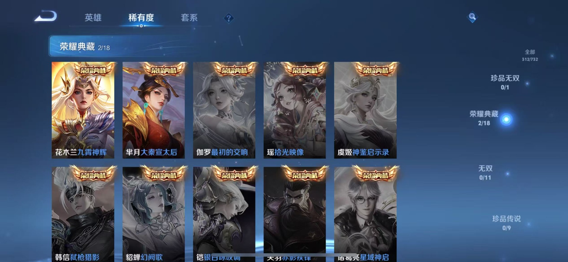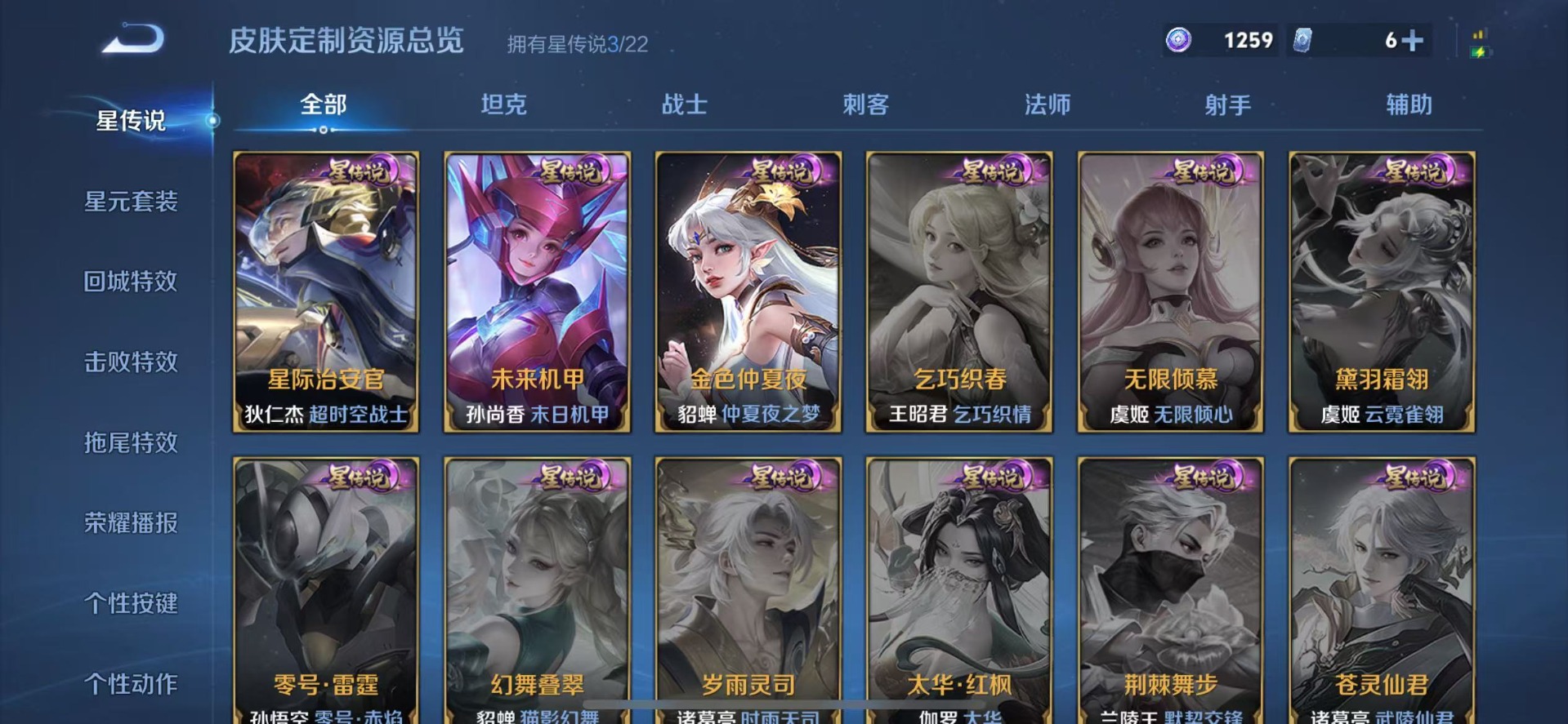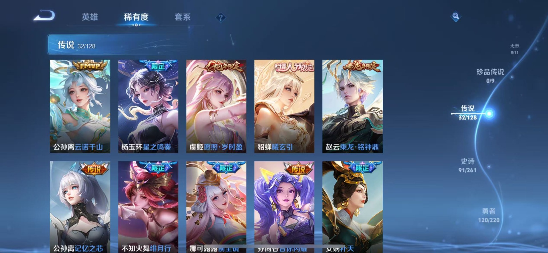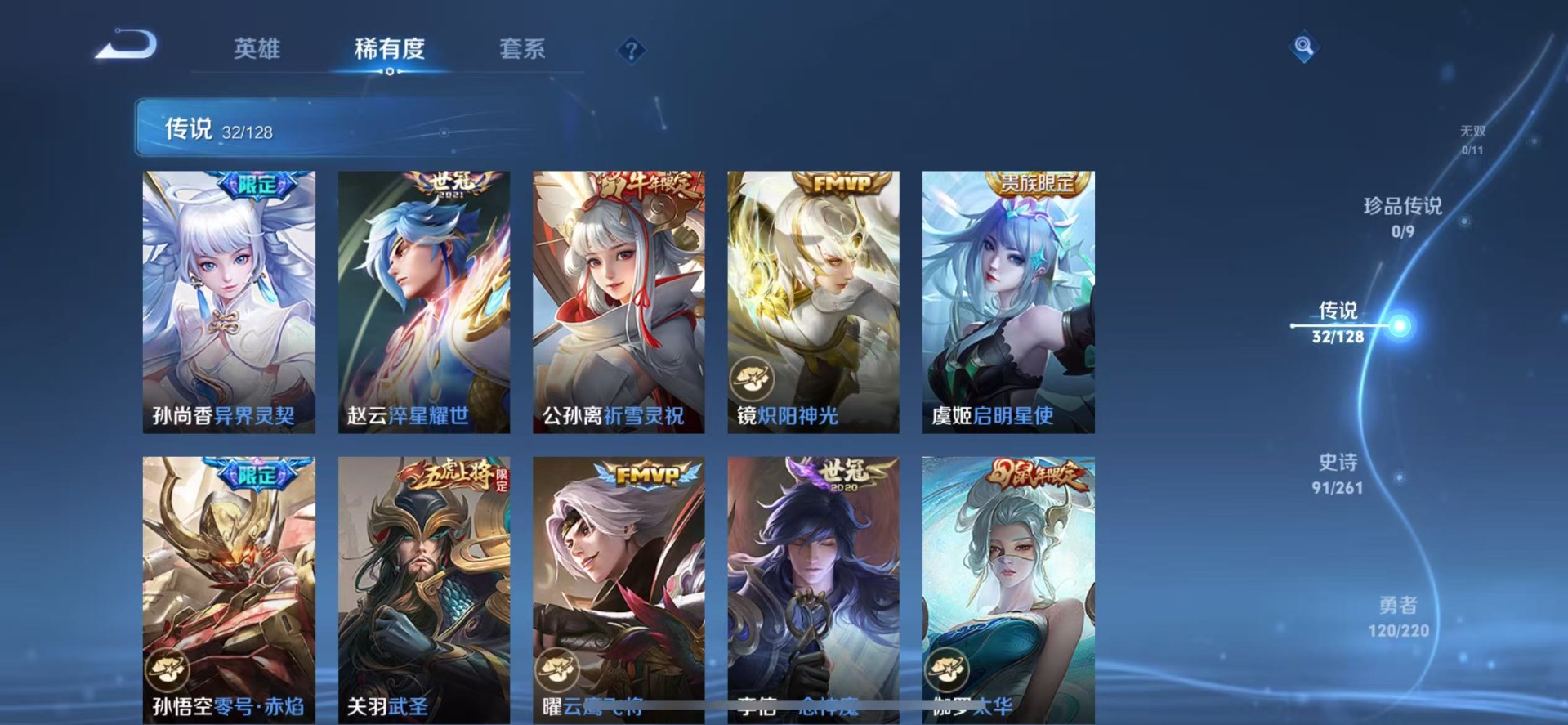 黄忠烈魂,甄姬女儿国国王,伽罗太华,赵云龙胆,孙膑天狼运算者,孙尚香异界灵契,不知火舞绯月行,吕布御风骁将,后羿辉光之辰,露娜一生所爱,杨玉环寅虎·心曲,公孙离祈雪灵祝,公孙离玉兔公主,裴擒虎李小龙,上官婉儿梁祝,上官婉儿天狼绘梦者,花木兰默契交锋,花木兰青春决赛季,女娲补天,芈月白晶晶,孙悟空至尊宝,百里玄策白虎志,马超神威,雅典娜神奇女侠,妲己时之彼端,韩信傲雪梅枪,韩信飞衡,虞姬霸王别姬,虞姬愿照·岁时盈,娜可露露前尘镜,嫦娥如梦令,关羽武圣