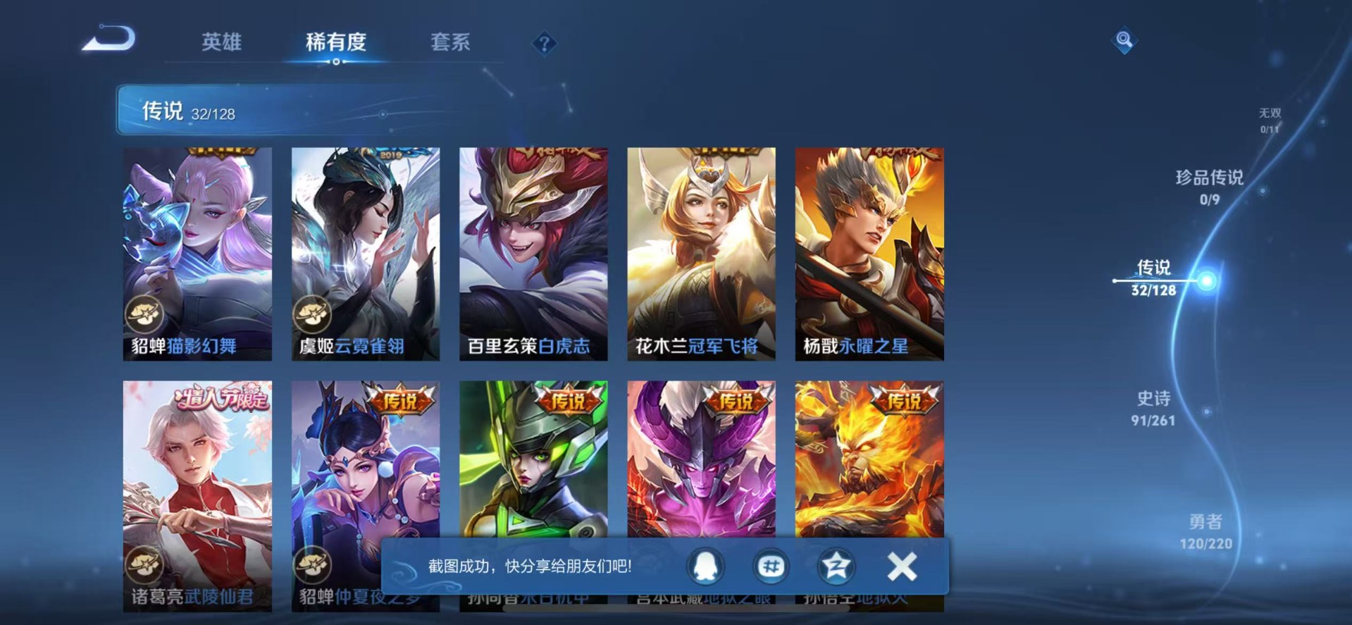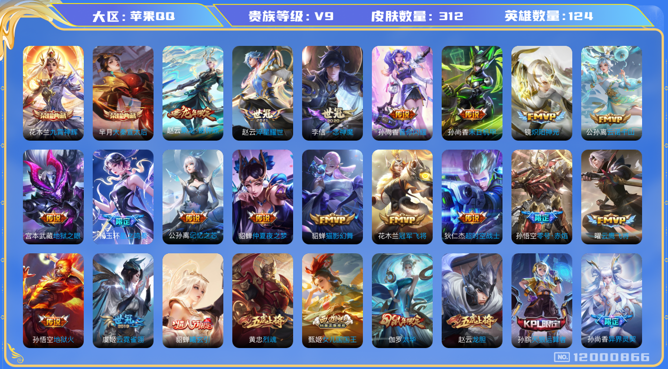 [12000866]V9 2典藏 32传说 124英雄 312皮肤 可修改实名 女号 优质装备:大秦宣太后,九霄神辉(木兰典藏),冠军飞将,云鹰飞将(小将军),猫影幻舞,炽阳神光,一念神魔,云霓雀翎,末日机甲-孙尚香(绿蚂蚱),地狱火,仲夏夜之梦(大飞蛾),零号·赤焰,地狱之眼,淬星耀世,超时空战士-狄仁杰,音你闪耀(rap皮),记忆之芯(机甲兔),涂山容容 传说皮:乘龙·铭钟鼎(赵云年限),貂蝉曦玄引,云诺千山,星之鸣奏 珍宝阁皮:女武神,玩趣恶龙 限定皮:愿照·岁时盈(虞姬年限),至尊宝,白虎志(电光耗子),太华(伽罗年限),武陵仙君(小桃花),异界灵契(白毛香),傲雪梅枪,补天,前尘镜,绯月行,时之彼端,白晶晶,神威(电光马子),飞衡(韩信年限),遇见飞天,高山流水,五谷丰年,武圣,天狼运算者,梁祝,御风骁将(吕布年限),龙胆,烈魂,祈雪灵祝(雪兔子),天狼绘梦者,李小龙,永曜之星,辉光之辰,如梦令-嫦娥,霸王别姬-虞姬,默契交锋-花木兰,一生所爱,天魔缭乱,青春决赛季,神奇女侠,女儿国国王,寅虎·心曲(虎婆),玉兔公主 史诗皮:化蝶舞,紫霞仙子,白龙吟,黄金分割率,千年之狐,永昼,江河有灵,魅语,百解令(蒙犽),无限星赏官,冰冠公主,青蛇,偶像歌手,晚萤,暗夜猫娘,银翎春语,龙骑士(小龙虾),末日机甲-吕布,猫狗日记-孙策,时之恋人-孙尚香,节奏热浪,摇滚巨星,水果甜心,天才门将,星夜王子,心灵骇客,功夫厨神,暗隐猎兽者,幽灵船长,鬼剑武藏,暗渊魔法,舞动绿茵,诗语江南,纤云弄巧,繁星吟游(呼啦呼啦),拒霜思,缤纷独角兽,乘风破浪,逐浪之夏,水晶猎龙者,唤灵魅影,圣诞狂欢,圣诞恋歌,鹰眼统帅,魅力维加斯,黎明之约,无心,未来纪元-赵云