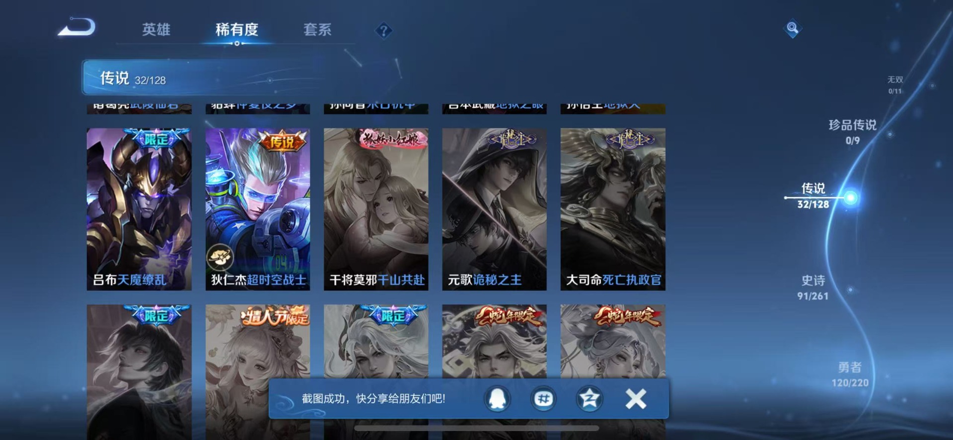 - [11632607]V6 3传说 122英雄 95皮肤 可修改实名 优质装备:黄金射手座,久胜战神,地狱之眼 珍宝阁皮:蔷薇恋人 限定皮:李小龙,逐梦之影 史诗皮:白龙吟,千年之狐,乱世虎臣,节奏热浪,修罗,心灵骇客,水晶猎龙者,曙光守护者,金属风暴,圣诞狂欢,魅力维加斯