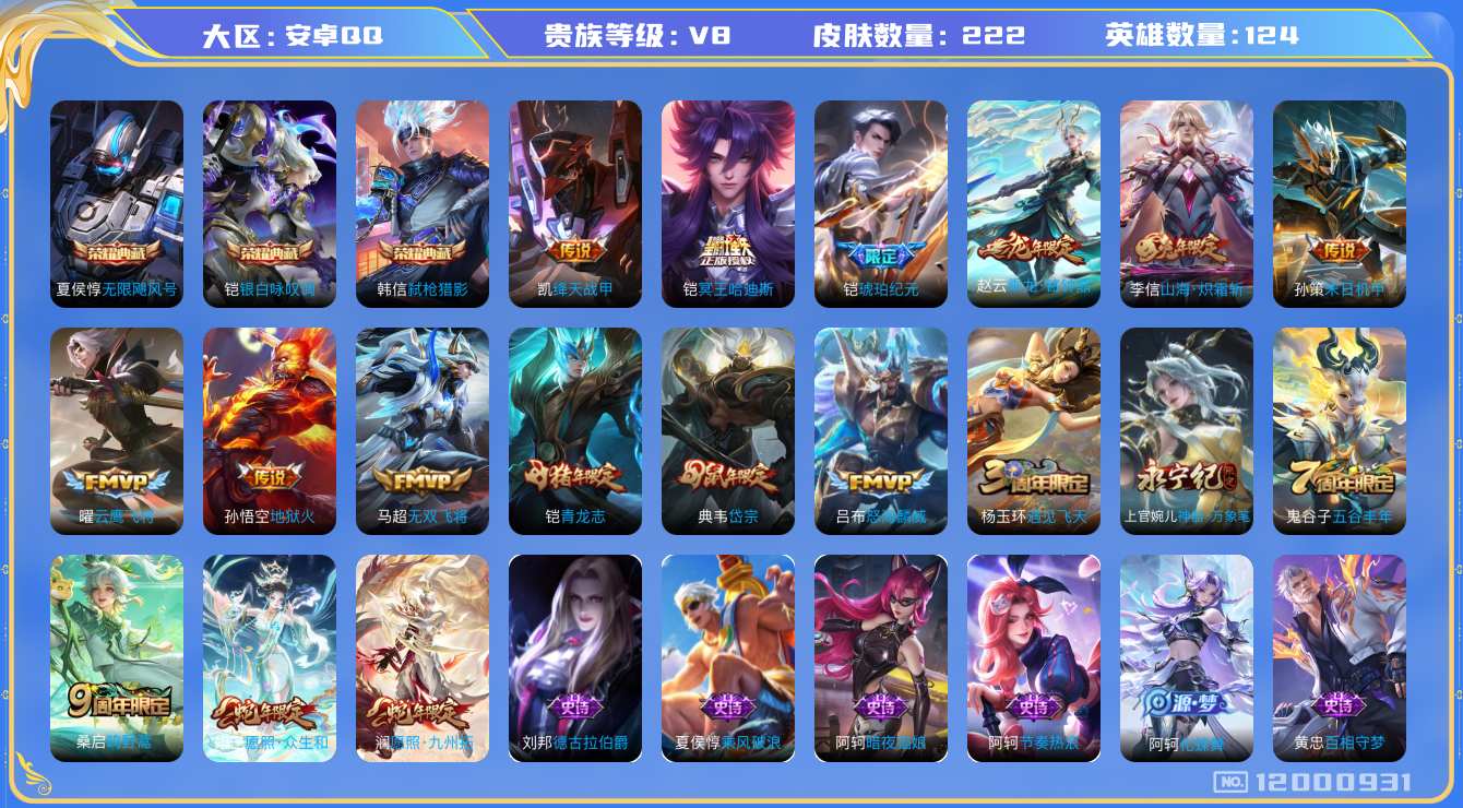 [12000931]V8 3典藏 14传说 124英雄 222皮肤 可修改实名 优质装备:无限飓风号(高达),银白咏叹调(倪克斯侍卫),弑枪猎影(韩信典藏),云鹰飞将(小将军),绛天战甲(鸡嘴战神),地狱火,末日机甲-孙策,无双飞将,山海·炽霜斩(李信年限),琥珀纪元铠 传说皮:乘龙·铭钟鼎(赵云年限),铠冥王哈迪斯 珍宝阁皮:万物之道,蔷薇恋人 限定皮:愿照·九州拓(澜年限),愿照·众生和(妲己年限),鸣野蒿,遇见飞天,怒海麟威,五谷丰年,青龙志(铠年限),岱宗(典韦年限),神器·万象笔 史诗皮:化蝶舞,星界战将,龙之律动,石田雨龙,百相守梦-周瑜,茶境仙,破空之剑,琥珀纪元伽罗,百相守梦-百里守约,百相守梦-黄忠,织梦人,紫霞仙子,苍穹之光,白龙吟,黄金分割率,特工魅影,千年之狐,永昼,蒙恬荣光圣徽,冰冠公主,青蛇,偶像歌手,晚萤,暗夜猫娘,龙骑士(小龙虾),末日机甲-吕布,猫狗日记-孙策,乱世虎臣,节奏热浪,摇滚巨星,水果甜心,绅士熊喵,天才门将,星夜王子,功夫厨神,德古拉伯爵,暗隐猎兽者,幽灵船长,鬼剑武藏,心灵战警,舞动绿茵,地狱岩魂,纤云弄巧,拒霜思,乘风破浪,逐浪之夏,水晶猎龙者,曙光守护者,箭羽风息,唤灵魅影,金属风暴,原初追逐者,圣诞狂欢,鹰眼统帅,魅力维加斯,黎明之约,无心,未来纪元-赵云