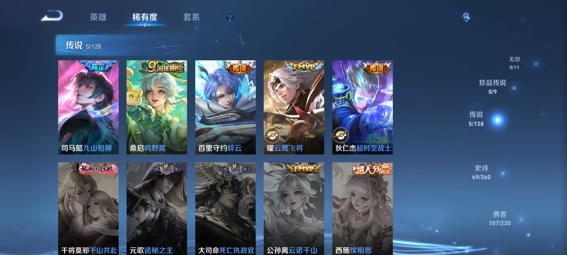 - [11294842]V7 1典藏 1无双 2珍品传说 13传说 123英雄 135皮肤 可修改实名 优质装备:鸣剑·曳影,器灵·螭龙剑,器灵·落星盏,地狱之眼,山海·炽霜斩(李信年限),燃星之曲,浮生妄 珍品传说:时之奇旅-孙策 传说皮:星之鸣奏,祥瑞亨通,幻光神枪 珍宝阁皮:女武神 限定皮:愿照·九州拓(澜年限),愿照·岁时盈(虞姬年限),愿照·山河定(司空震年限),愿照·千秋盛(女娲年限),鸣野蒿,时雨天司(水龙头),遇见飞天 史诗皮:鸭鸭历险记-刘禅,苍鳞隐世,器灵·浮梦炉,化蝶舞,龙之律动,石田雨龙,百相守梦-周瑜,茶境仙,百相守梦-百里守约,百相守梦-黄忠,紫霞仙子,千年之狐,电玩·爆裂旋风,江河有灵,雪夜绮愿(周瑜),龙骑士(小龙虾),暗夜猫娘,晚萤,末日机甲-吕布,时之恋人-孙尚香,节奏热浪,女仆咖啡,摇滚巨星,水果甜心,星夜王子,心灵骇客,幽灵船长,乐园奇幻夜,纤云弄巧,逐浪之夏,水晶猎龙者,箭羽风息,圣诞恋歌,鹰眼统帅,魅力维加斯,黎明之约