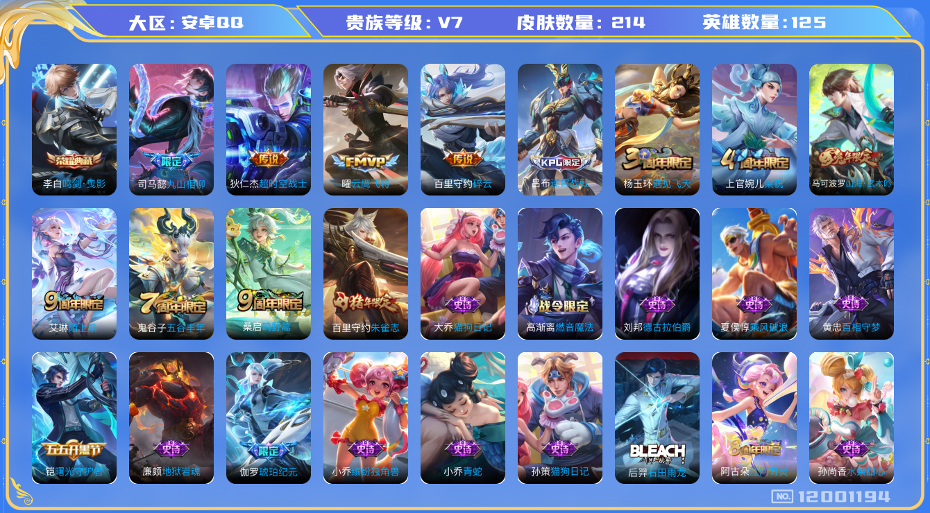 [12001194]V7 1典藏 5传说 125英雄 214皮肤 可修改实名 优质装备:鸣剑·曳影,云鹰飞将(小将军),超时空战士-狄仁杰,碎云,涂山容容 传说皮:九山相柳 珍宝阁皮:妄想食味,优雅恋人 限定皮:逐霄战戟,陌上桑,鸣野蒿,遇见飞天,五谷丰年,梁祝,朱雀志(守约年限),山海·玄木吟(马可年限) 史诗皮:龙之律动,石田雨龙,百相守梦-周瑜,幻珠鲛人,琥珀纪元伽罗,蔬乡物语(鲁班七号),百相守梦-百里守约,百相守梦-黄忠,织梦人,守夜人,紫霞仙子,黄金分割率,特工魅影,千年之狐,江河有灵,末日机甲-莱西奥,雪夜绮愿(周瑜),真我赫兹(百里守约),魅语,百解令(蒙犽),高渐离燃音魔法,蒙恬荣光圣徽,冰冠公主,青蛇,猫狗日记-孙策,猫狗日记-大乔,女仆咖啡,水果甜心,天才门将,星夜王子,心灵骇客,德古拉伯爵,暗隐猎兽者,鬼剑武藏,心灵战警,舞动绿茵,地狱岩魂,纤云弄巧,拒霜思,缤纷独角兽,乘风破浪,逐浪之夏,水晶猎龙者,曙光守护者,金属风暴,原初追逐者,圣诞恋歌,鹰眼统帅,魅力维加斯,黎明之约,滕王阁序,无心