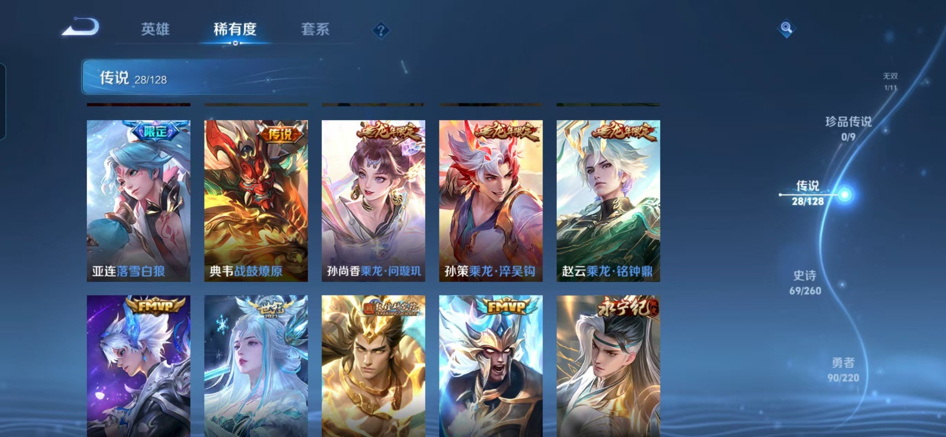 不知火舞绯月行,司空震愿照·山河定,裴擒虎李小龙,桑启鸣野蒿,女娲愿照·千秋盛,孙悟空孙行者,孙悟空至尊宝,盘古冰霜神祇,云中君时之祈愿,妲己愿照·众生和,蔡文姬愿照·福禄聚,澜愿照·九州拓,虞姬愿照·岁时盈