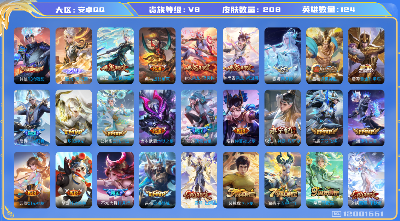 [12001661]V8 1典藏 1无双 28传说 124英雄 208皮肤 可修改实名 优质装备:弑枪猎影(韩信典藏),器灵·螭龙剑,黄金射手座,炽阳神光,仲夏夜之梦(大飞蛾),地狱之眼,胖达荣荣,无双飞将,神器·狴犴令,遇见神鼓,霜月吟,澜逐花归海,千劫归真 传说皮:乘龙·问璇玑(孙尚香年限),乘龙·铭钟鼎(赵云年限),乘龙·淬吴钩(孙策年限),典韦战鼓燎原,落雪白狼,云诺千山,幻光神枪 珍宝阁皮:妄想食味,玩趣恶龙 限定皮:愿照·九州拓(澜年限),愿照·福禄聚(蔡文姬年限),愿照·岁时盈(虞姬年限),愿照·山河定(司空震年限),愿照·众生和(妲己年限),愿照·千秋盛(女娲年限),鸣野蒿,至尊宝,绯月行,怒海麟威,五谷丰年,李小龙,孙行者,时之祈愿-云中君,冰霜神祇 史诗皮:器灵·浮梦炉,化蝶舞,星界战将,龙之律动,茶境仙,炽弈燎原,撼地雄心,破空之剑,战舞者,上官婉儿群星魔术团,蔬乡物语(鲁班七号),百相守梦-百里守约,星界特工,紫霞仙子,苍穹之光,特工魅影,江河有灵,百解令(蒙犽),高渐离燃音魔法,蒙恬荣光圣徽,偶像歌手,电玩·爆裂旋风,末日机甲-吕布,猫狗日记-孙策,乱世虎臣,女仆咖啡,水果甜心,绅士熊喵,天才门将,星夜王子,心灵骇客,功夫厨神,德古拉伯爵,暗隐猎兽者,幽灵船长,鬼剑武藏,暗渊魔法,心灵战警,乐园奇幻夜,地狱岩魂,纤云弄巧,拒霜思,乘风破浪,逐浪之夏,水晶猎龙者,曙光守护者,箭羽风息,金属风暴,原初追逐者,圣诞狂欢,鹰眼统帅,黎明之约,无心,未来纪元-赵云