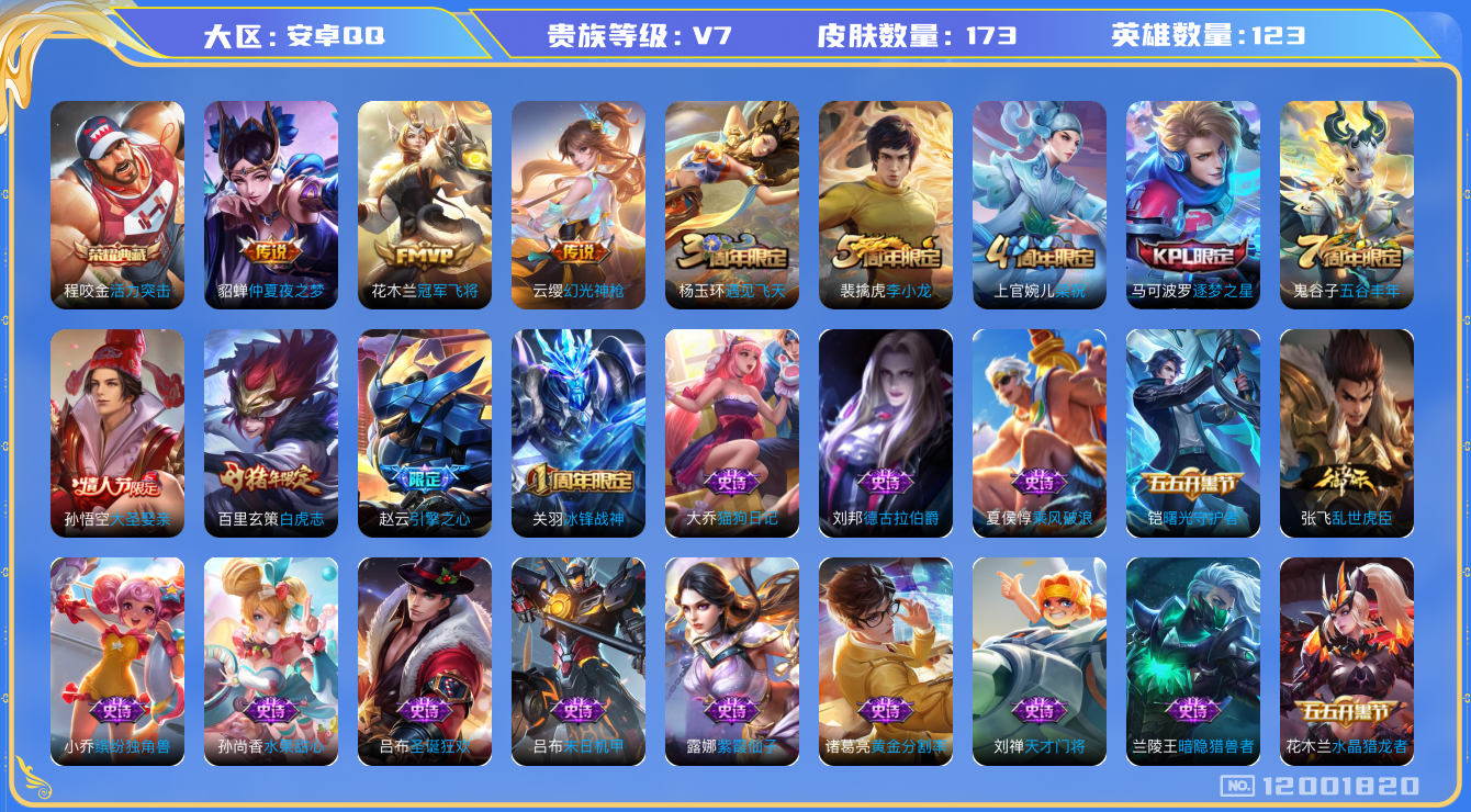 [12001820]V7 1典藏 4传说 123英雄 173皮肤 可修改实名 优质装备:活力突击,冠军飞将,仲夏夜之梦(大飞蛾) 传说皮:幻光神枪 珍宝阁皮:玩趣恶龙 限定皮:白虎志(电光耗子),遇见飞天,五谷丰年,冰锋战神,梁祝,逐梦之星,李小龙,大圣娶亲,引擎之心 史诗皮:紫霞仙子,黄金分割率,特工魅影,冰冠公主,偶像歌手,末日机甲-吕布,猫狗日记-大乔,乱世虎臣,女仆咖啡,水果甜心,天才门将,心灵骇客,功夫厨神,德古拉伯爵,暗隐猎兽者,舞动绿茵,缤纷独角兽,乘风破浪,水晶猎龙者,曙光守护者,金属风暴,圣诞狂欢,鹰眼统帅,暗夜贵公子,魅力维加斯