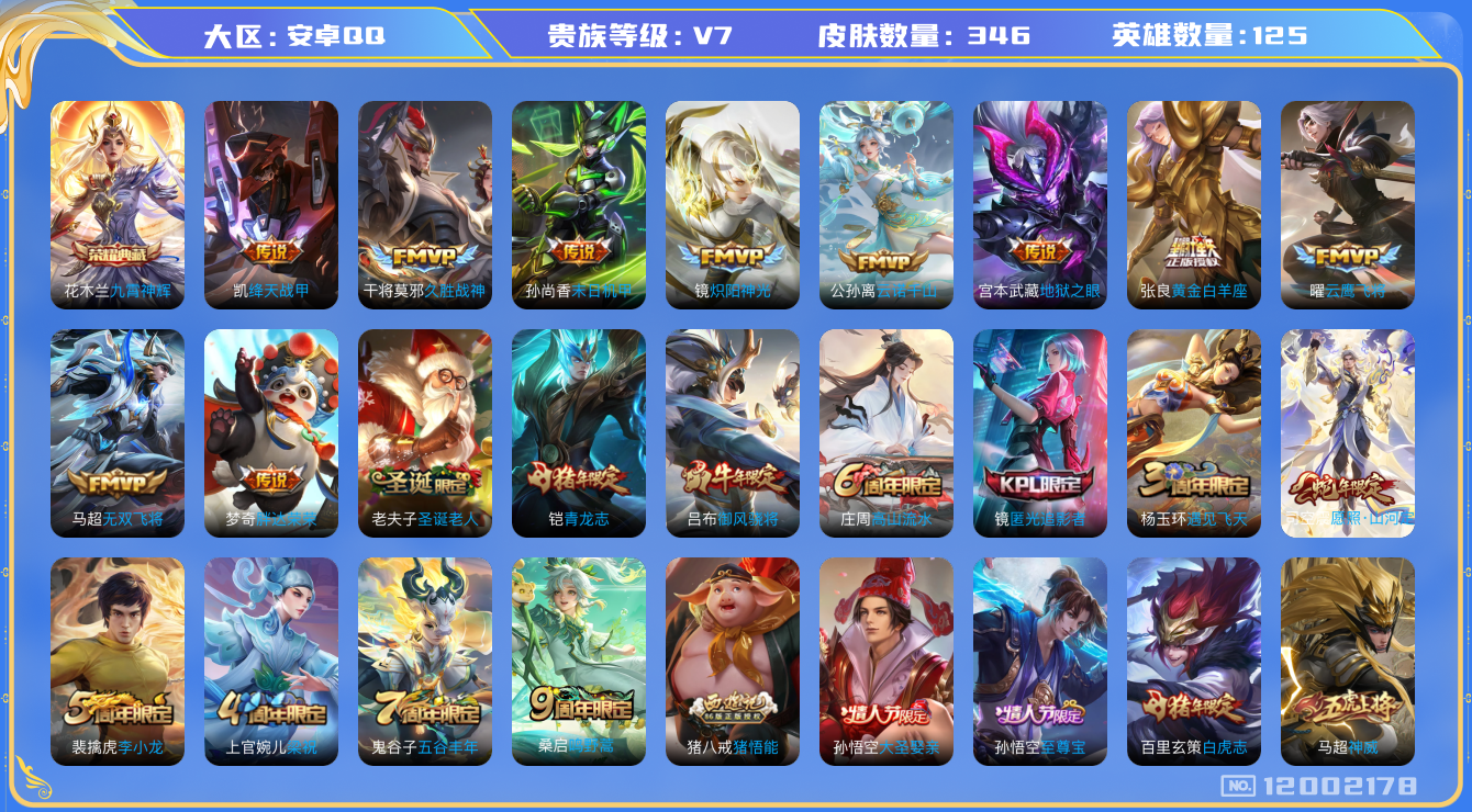 [12002178]V7 1典藏 13传说 125英雄 345皮肤 可修改实名 优质装备:九霄神辉(木兰典藏),云鹰飞将(小将军),绛天战甲(鸡嘴战神),黄金白羊座,久胜战神,炽阳神光,末日机甲-孙尚香(绿蚂蚱),地狱之眼,胖达荣荣,无双飞将,涂山容容 传说皮:云诺千山 珍宝阁皮:妄想食味,蔷薇恋人,女武神 限定皮:愿照·山河定(司空震年限),鸣野蒿,至尊宝,白虎志(电光耗子),神威(电光马子),遇见飞天,高山流水,五谷丰年,青龙志(铠年限),梁祝,御风骁将(吕布年限),李小龙,圣诞老人,猪悟能,大圣娶亲,匿光追影者 史诗皮:鸭鸭历险记-刘禅,化蝶舞,灵蛊蚀心,星界战将,龙之律动,茶境仙,蒙犽顽岩魄,蔬乡物语(鲁班七号),百相守梦-黄忠,紫霞仙子,电玩小子(小书包),白龙吟,黄金分割率,特工魅影,千年之狐,永昼,江河有灵,魅语,百解令(蒙犽),高渐离燃音魔法,蒙恬荣光圣徽,无限星赏官,冰冠公主,青蛇,晚萤,电玩·爆裂旋风,龙骑士(小龙虾),末日机甲-吕布,猫狗日记-孙策,猫狗日记-大乔,乱世虎臣,节奏热浪,修罗,女仆咖啡,摇滚巨星,水果甜心,绅士熊喵,天才门将,星夜王子,功夫厨神,德古拉伯爵,暗隐猎兽者,幽灵船长,鬼剑武藏,心灵战警,舞动绿茵,地狱岩魂,纤云弄巧,繁星吟游(呼啦呼啦),拒霜思,缤纷独角兽,乘风破浪,逐浪之夏,龙鼓争鸣,月团寄思,水晶猎龙者,箭羽风息,金属风暴,原初追逐者,圣诞狂欢,圣诞恋歌,鹰眼统帅,王者之锤,暗夜贵公子,魅力维加斯,黎明之约,赏金猎手,无心,未来纪元-赵云