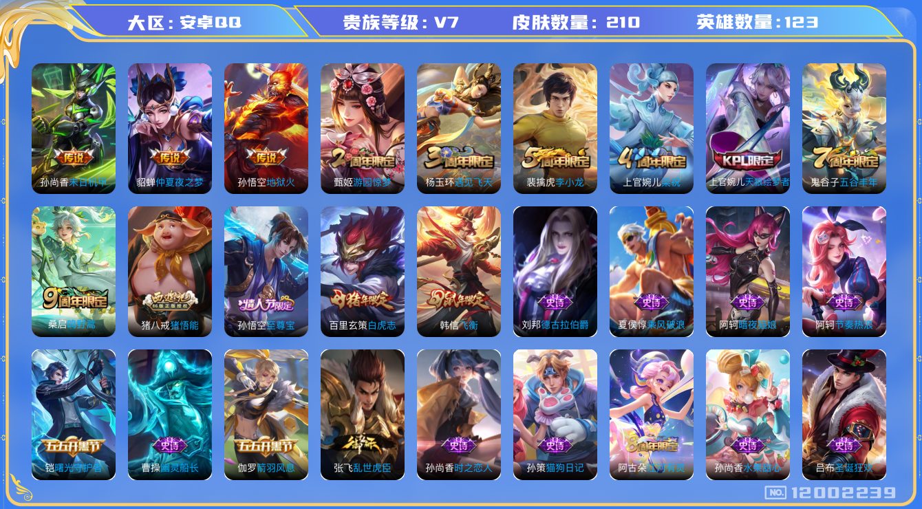 [12002239]V7 5传说 123英雄 210皮肤 可修改实名 女号 优质装备:末日机甲-孙尚香(绿蚂蚱),地狱火,仲夏夜之梦(大飞蛾) 珍宝阁皮:妄想食味,玩趣恶龙 限定皮:鸣野蒿,至尊宝,白虎志(电光耗子),飞衡(韩信年限),遇见飞天,五谷丰年,游园惊梦,梁祝,天狼绘梦者,李小龙,猪悟能 史诗皮:黄金分割率,特工魅影,千年之狐,江河有灵,雪夜绮愿(周瑜),蒙恬荣光圣徽,电玩·爆裂旋风,暗夜猫娘,末日机甲-吕布,猫狗日记-孙策,时之恋人-孙尚香,乱世虎臣,节奏热浪,水果甜心,天才门将,星夜王子,心灵骇客,德古拉伯爵,暗隐猎兽者,幽灵船长,鬼剑武藏,心灵战警,舞动绿茵,纤云弄巧,繁星吟游(呼啦呼啦),乘风破浪,逐浪之夏,水晶猎龙者,曙光守护者,箭羽风息,金属风暴,原初追逐者,圣诞狂欢,圣诞恋歌,鹰眼统帅,魅力维加斯,黎明之约,未来纪元-赵云