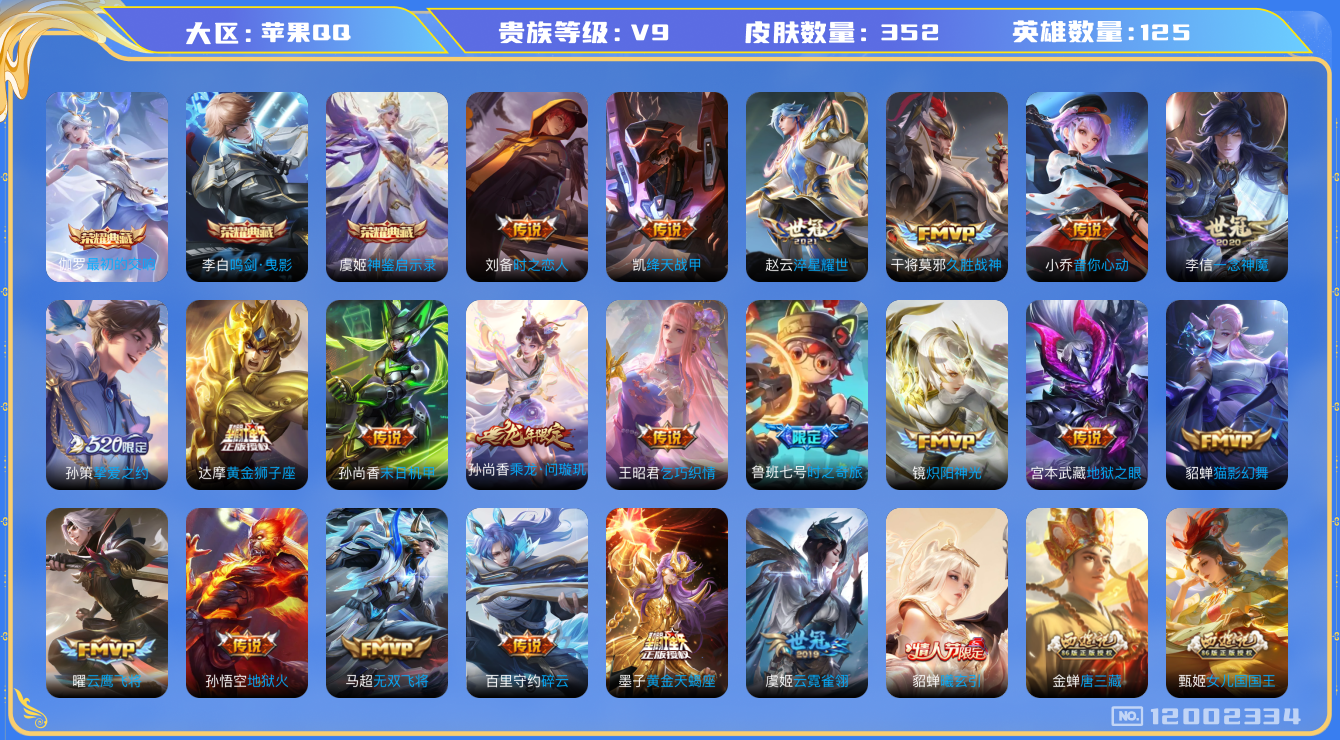 [12002334]V9 3典藏 30传说 125英雄 352皮肤 可修改实名 优质装备:鸣剑·曳影,神鉴启示录,最初的交响(伽罗典藏),黄金狮子座,云鹰飞将(小将军),绛天战甲(鸡嘴战神),猫影幻舞,久胜战神,炽阳神光,一念神魔,云霓雀翎,末日机甲-孙尚香(绿蚂蚱),地狱火,音你心动-小乔,地狱之眼,乞巧织情,时之恋人-刘备(电焊工),淬星耀世,挚爱之约,无双飞将,碎云,鲁班七号-时之奇旅,黄金天蝎座,涂山容容 传说皮:乘龙·问璇玑(孙尚香年限),貂蝉曦玄引 珍宝阁皮:妄想食味,玩趣恶龙 限定皮:愿照·千秋盛(女娲年限),鸣野蒿,至尊宝,凤求凰(白切鸡),凤凰于飞,傲雪梅枪,白晶晶,时雨天司(水龙头),至美·化雀舞,遇见飞天,怒海麟威,梁祝,李小龙,如梦令-后羿,孙行者,猪悟能,一生所爱,大圣娶亲,热情桑巴,女儿国国王,寅虎·御盾(廉颇年限),玉兔公主,深海之息(深海大菠萝),唐三藏 史诗皮:鸭鸭历险记-刘禅,化蝶舞,星界战将,龙之律动,茶境仙,怒海争锋,蒙犽顽岩魄,海诺心动手记,夜落电台,蔬乡物语(鲁班七号),曹操夜都魔契,织梦人,遇见神鹿,紫霞仙子,苍穹之光,电玩小子(小书包),白龙吟,黄金分割率,特工魅影,千年之狐,永昼,江河有灵,浮梦罗烟,魅语,无限星赏官,冰冠公主,偶像歌手,晚萤,电玩·爆裂旋风,百相守梦(关羽),银翎春语,龙骑士(小龙虾),末日机甲-吕布,猫狗日记-孙策,猫狗日记-大乔,时之恋人-孙尚香,乱世虎臣,节奏热浪,女仆咖啡,摇滚巨星,水果甜心,绅士熊喵,天才门将,星夜王子,心灵骇客,时之奇旅-安琪拉,功夫厨神,德古拉伯爵,暗隐猎兽者,幽灵船长,鬼剑武藏,暗渊魔法,心灵战警,乐园奇幻夜,舞动绿茵,地狱岩魂,诗语江南,缤纷独角兽,乘风破浪,逐浪之夏,月团寄思,水晶猎龙者,曙光守护者,箭羽风息,金属风暴,原初追逐者,圣诞狂欢,圣诞恋歌,鹰眼统帅,暗夜贵公子,魅力维加斯,黎明之约,赏金猎手,奇遇舞章,寅虎·御盾,未来纪元-赵云
