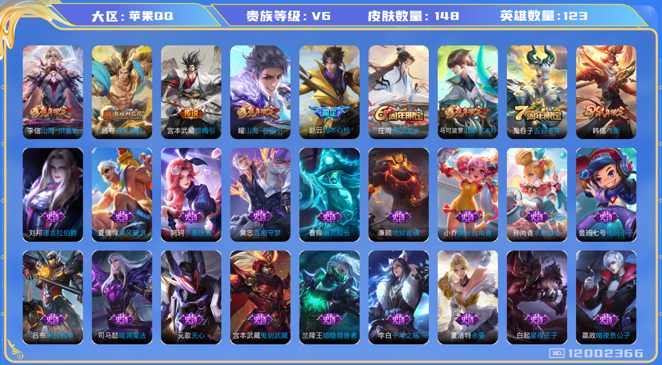 [12002366]V6 4传说 123英雄 148皮肤 可修改实名 优质装备:山海·炽霜斩(李信年限),山海·苍雷引(电光曜子),惊梅引,遇见神鼓 珍宝阁皮:蔷薇恋人 限定皮:飞衡(韩信年限),高山流水,五谷丰年,百木心枪,山海·玄木吟(马可年限) 史诗皮:百相守梦-黄忠,电玩小子(小书包),白龙吟,特工魅影,千年之狐,永昼,蒙恬荣光圣徽,末日机甲-吕布,节奏热浪,水果甜心,星夜王子,德古拉伯爵,暗隐猎兽者,幽灵船长,鬼剑武藏,暗渊魔法,地狱岩魂,缤纷独角兽,乘风破浪,逐浪之夏,金属风暴,原初追逐者,暗夜贵公子,魅力维加斯,赏金猎手,无心,未来纪元-赵云
